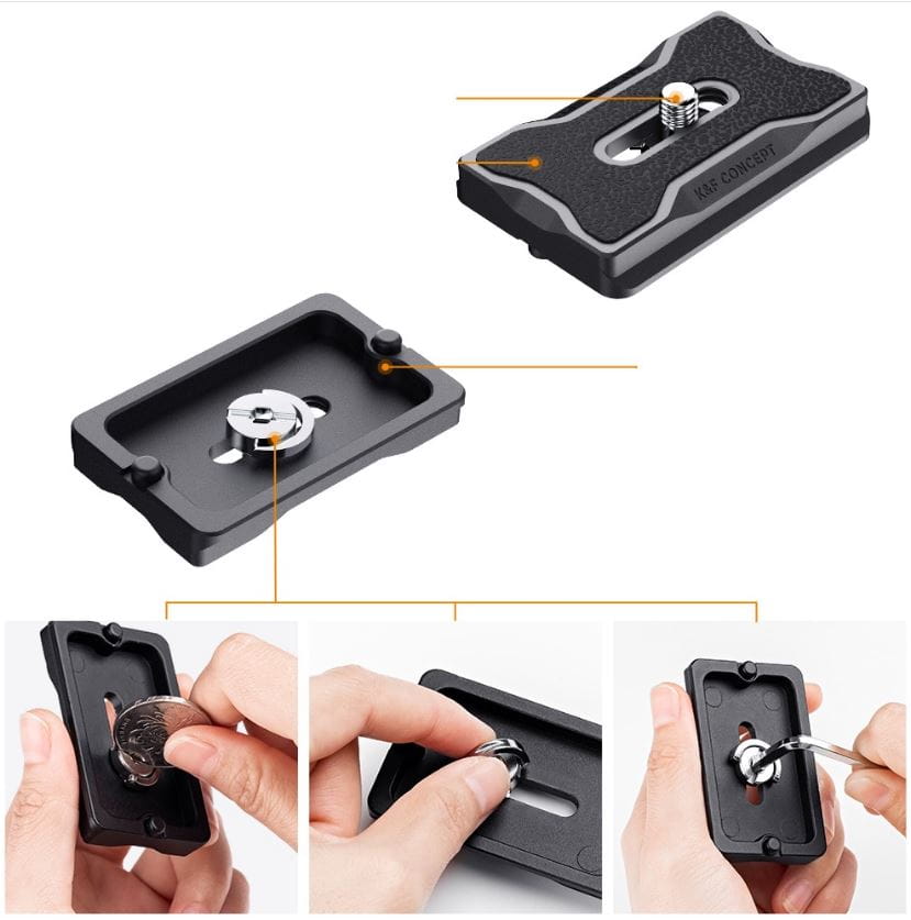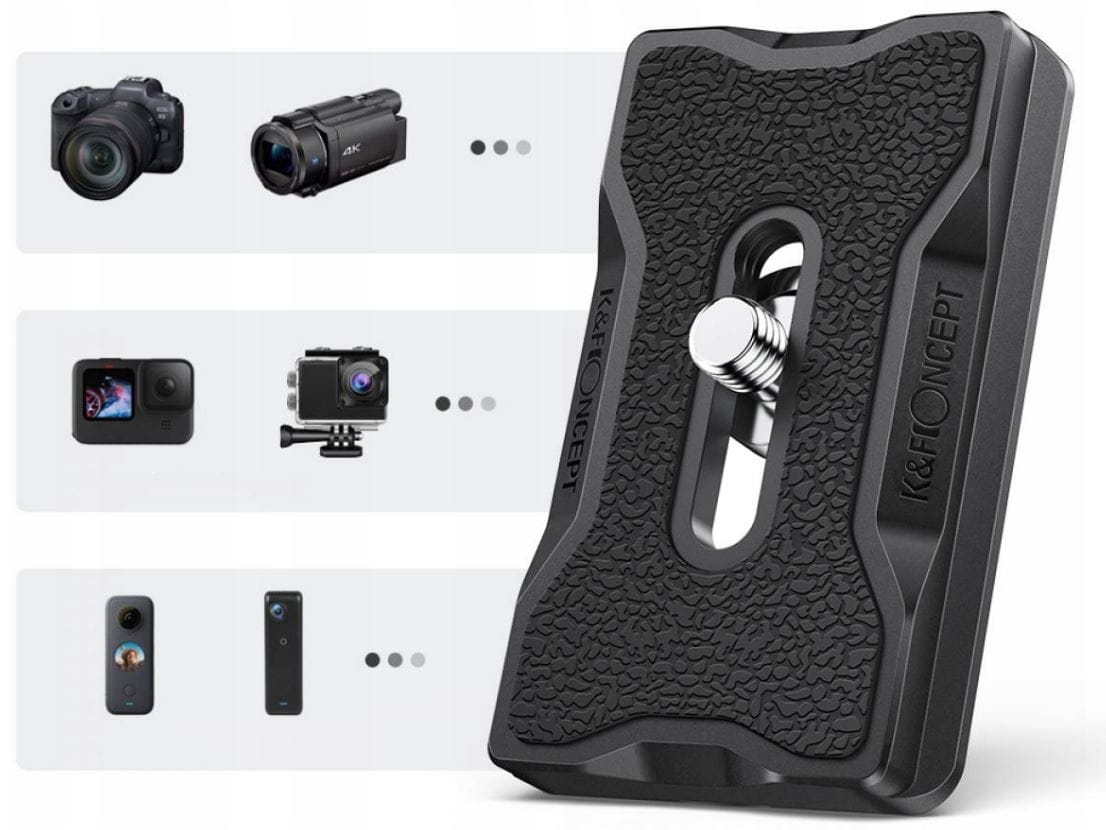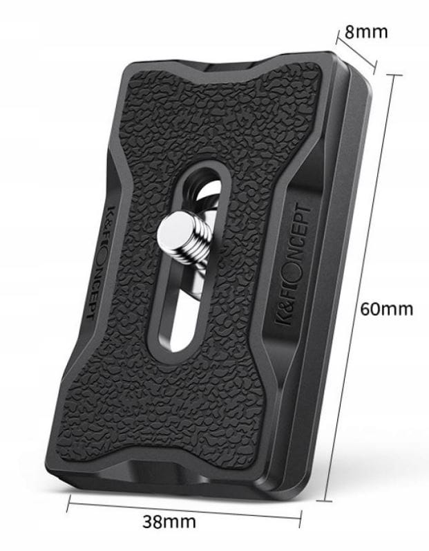 Szybkozłączka o wymiarach 60 x 38 x 8 mm przeznaczona jest do stosowania z aparatami, kamerami i akcesoriami posiadającymi gwint żeński 1/4 ".