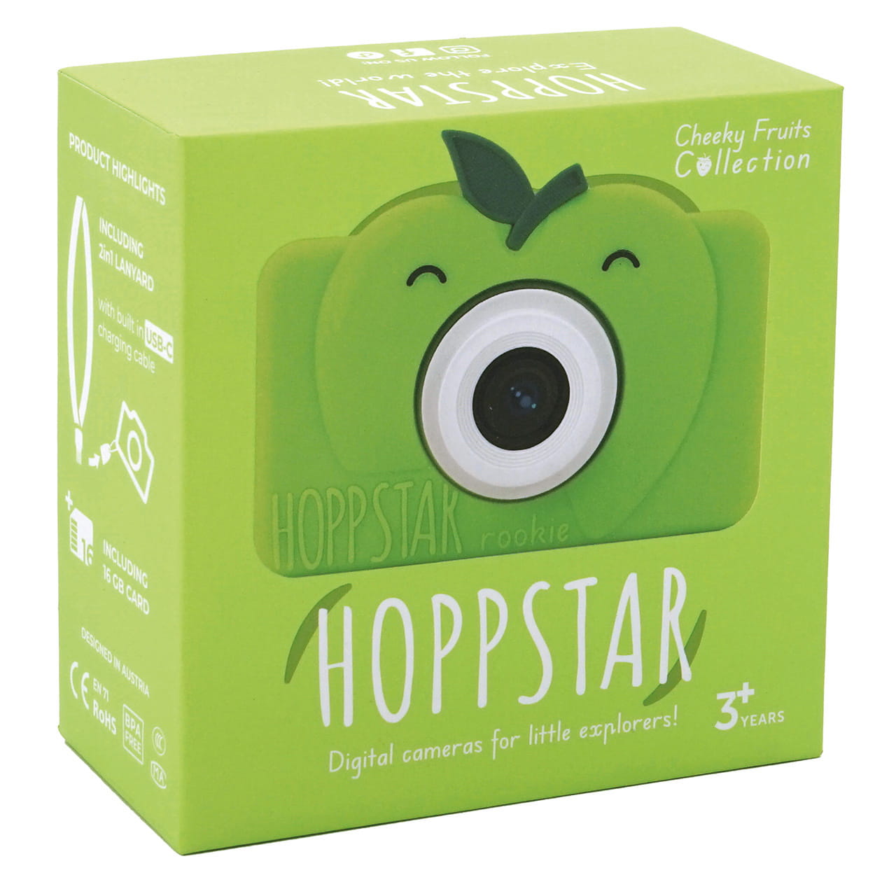 Cyfrowy aparat fotograficzny dla dzieci Rookie marki Hoppstar zachwyca swym designem. Wykonano go z najwyższej jakości materiałów. Dzięki temu jest nie tylko odporny na uderzenia, ale także wyjątkowo lekki i przyjemny w użyciu. Jego duże przyciski zapewniają łatwą obsługę i możliwość szybkiego zapoznania się z funkcjami aparatu. Zdejmowane silikonowe etui zapewnia ochronę w razie uderzeń i upadków oraz gwarantuje solidny chwyt, bez wyślizgiwania się z dłoni. Wszystko dlatego, że każdy detal tego wyjątkowego aparatu dla dzieci stworzony został właśnie z myślą o najmłodszych–ich potrzebach i umiejętnościach.
