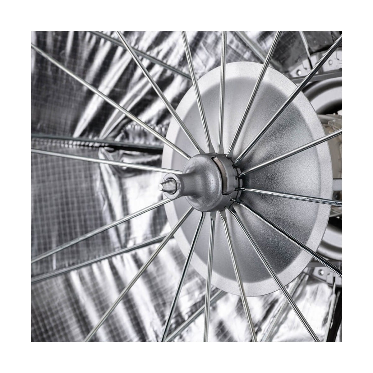 Sferyczna czasza tego softboxa to jedna z jego ważnych cech. To dzięki niej jest on nie tylko bardzo wydajny, ale też łatwy do stosowania zwłaszcza w ciasnych pomieszczeniach. Jeżeli jest taka potrzeba softbox może być używany także z plastrem miodu (dostępnym oddzielnie).