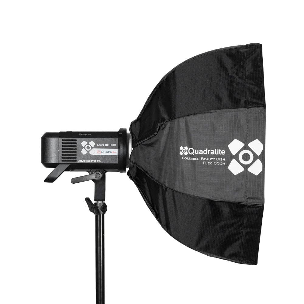Quadralite Flex Foldable Beauty-Dish to wszechstronny modyfikator światła, który jest lekki, mały po złożeniu i wykonany z najwyższej jakości materiałów. Może być używany jako beauty dish zapewniając bardzo charakterystyczne, ostre i kontrastowe światło wspaniale nadające się do fotografii typu beauty, portretowej i modowej. Kiedy jednak zachodzi potrzeba użycia bardzo miękkiego światła to można z łatwością je uzyskać a Flex Foldable Beauty-Dish zamienia się w tradycyjny softbox.