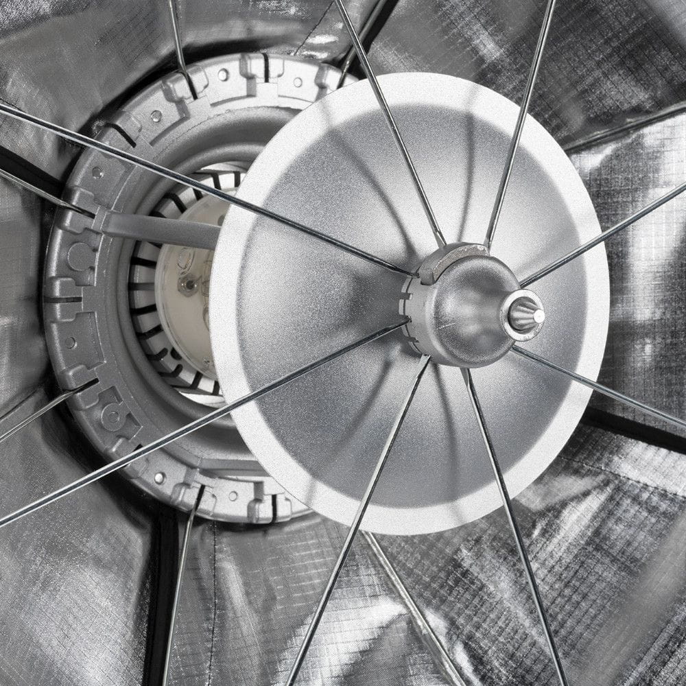 Sferyczna czasza tego softboxa to jedna z jego ważnych cech. To dzięki niej jest on nie tylko bardzo wydajny, ale też łatwy do stosowania zwłaszcza w ciasnych pomieszczeniach. Jeżeli jest taka potrzeba softbox może być używany także z plastrem miodu (dostępnym oddzielnie).