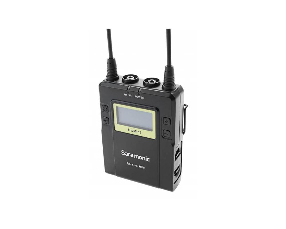 Saramonic RX-9 umożliwia odbiór dwóch grup nadających sygnał (A i B). Pracuje w zakresie częstotliwości od 514 MHz do 596 MHz z możliwością wyboru spośród 96 kanałów transmisji. Odbiornik wyposażony został w dwa wyjścia mini Jack (3,5 milimetra) z blokadą zabezpieczającą przed przypadkowym odłączeniem kabla. Do odbiornika podłączyć można urządzenie rejestrujące oraz słuchawki do odsłuchu przekazywanego sygnału.