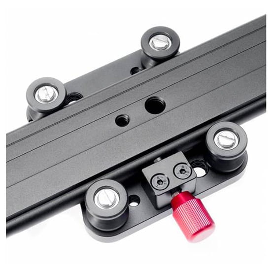 Płynność oraz precyzję pracy zapewnia system 4 łożyskowanych rolek, w które wyposażony został wózek slidera. Dołączona śruba 1/4” oraz adapter do 3/8" umożliwiają montaż urządzenia rejestrującego lub głowicy na wózku w jednej z 3 konfiguracji. Wózek oferuje także 2 dodatkowe gwinty w rozmiarze 3/8”, oraz hamulec zapobiegający niepożądanym ruchom po prowadnicy.