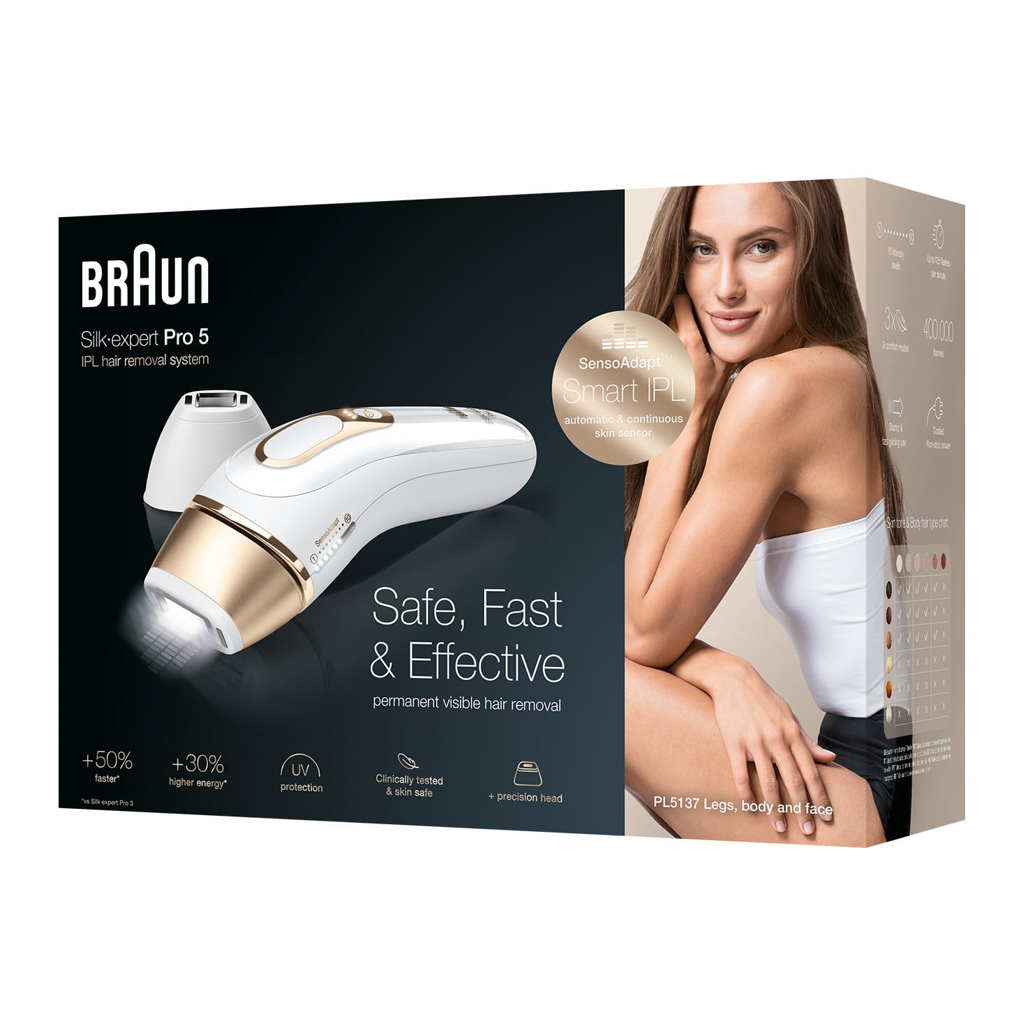 Silk-expert Pro 5 marki Braun to najbezpieczniejsze, najszybsze i najbardziej wydajne urządzenie IPL do Zauważalna redukcja ilości włosów nawet przez 6 miesięcy bez wychodzenia z domu. Automatycznie, na bieżąco dostosowuje się do indywidualnego kolorytu skóry, tak aby zapewnić optymalną równowagę pomiędzy wydajnością a zachowaniem bezpieczeństwa