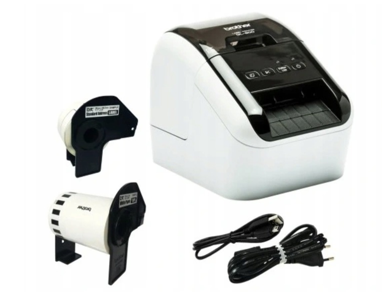 Drukarka etykiet QL-800 jest zasilana za pomocą zasilacza wewnętrznego. Sprzedawana jest w komplecie z przewodem zasilającym, kablem USB, zestawem 100 przyciętych etykiet adresowych oraz taśmą do druku dwukolorowego o wymiarach 62 mm na 5 metrów.