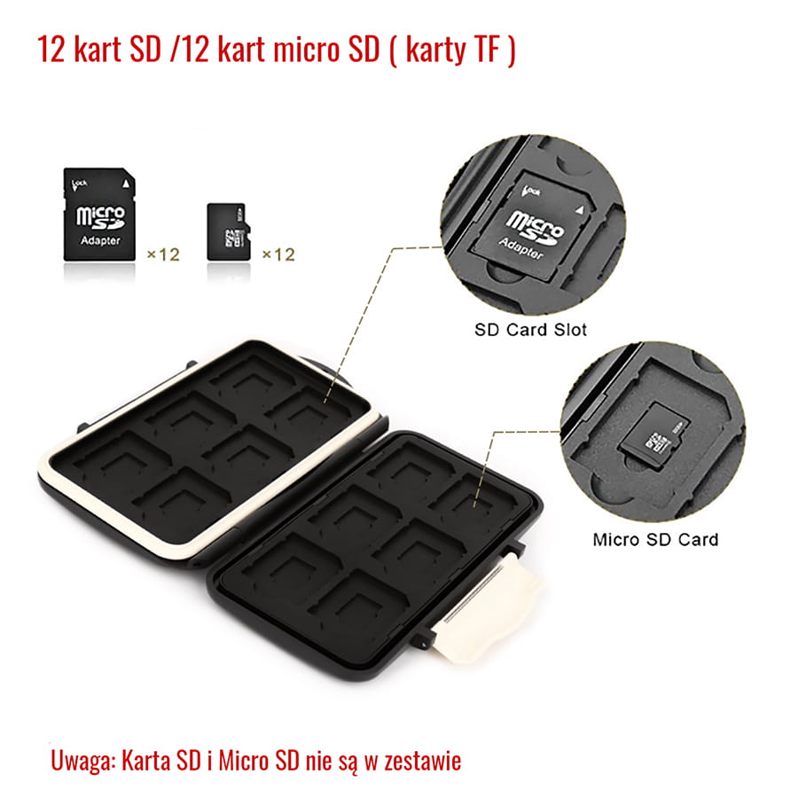 - Pojemność: 12 kart SD oraz 12 nośników microSD.