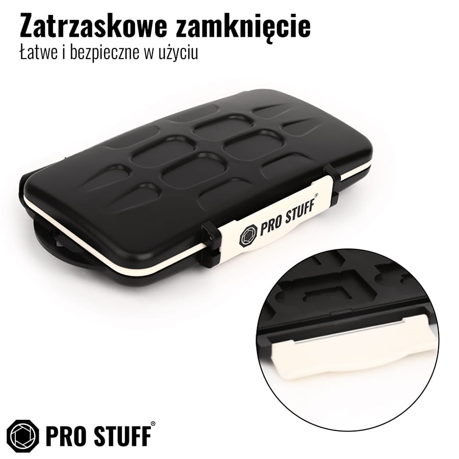 Pojemnik na karty pamięci oferowany przez markę Prostuff wyróżnia wysokiej jakości wykonanie z najlepszych gatunkowo materiałów oraz eleganckie wykończenie. Etui dostępne jest w czarno-białej wersji kolorystycznej, która z jednej strony prezentuje się dość minimalistycznie, z drugiej zaś elegancko.