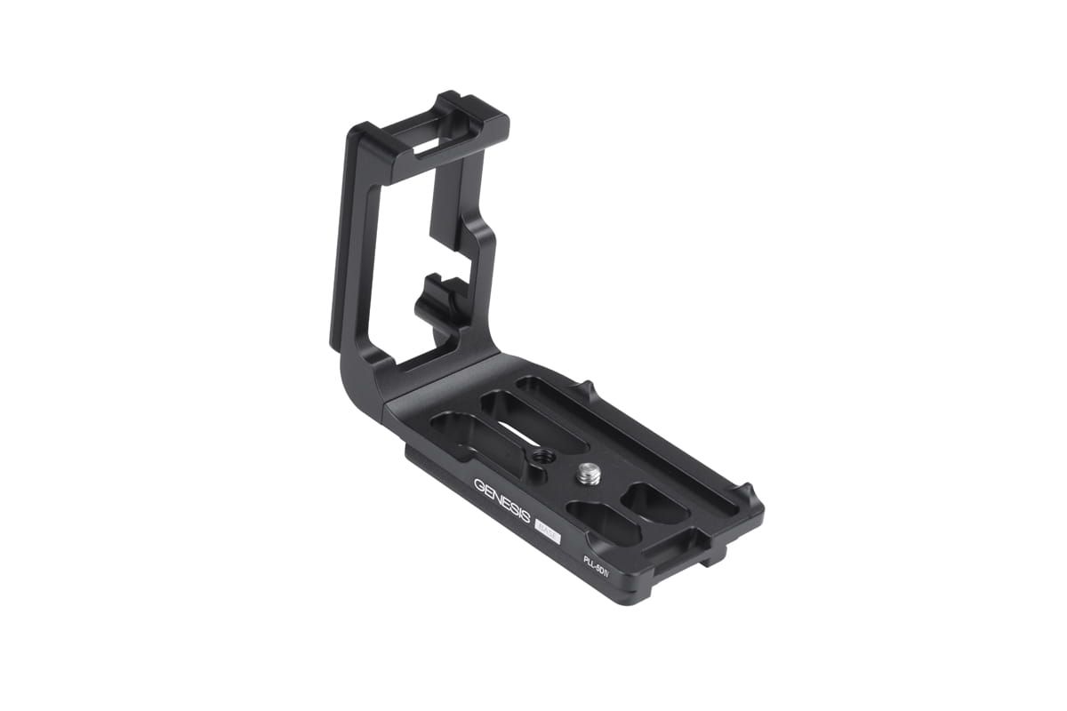 Płytka Genesis Base PLL- 5DIV to szybkozłączka typu "L". Umożliwia poziome lub pionowe zamocowanie aparatu fotograficznego w uchwycie głowicy z mocowaniem Arca- Swiss.