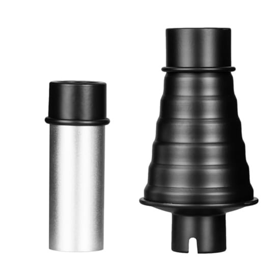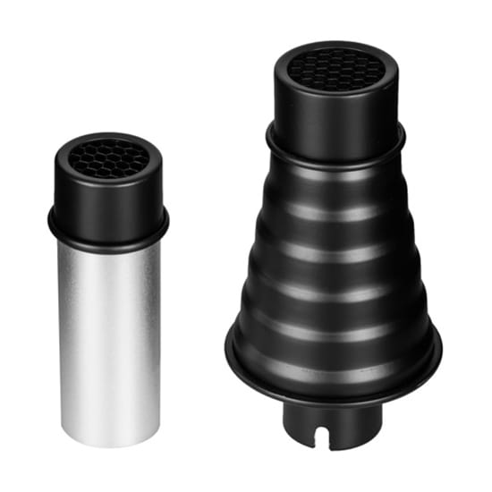 Zestaw nasadek Snoot przeznaczony jest do lamp Genesis Reporter. Składa się z nasadki prostej o średnicy 40mm oraz stożkowej o maksymalnej średnicy 80mm.
