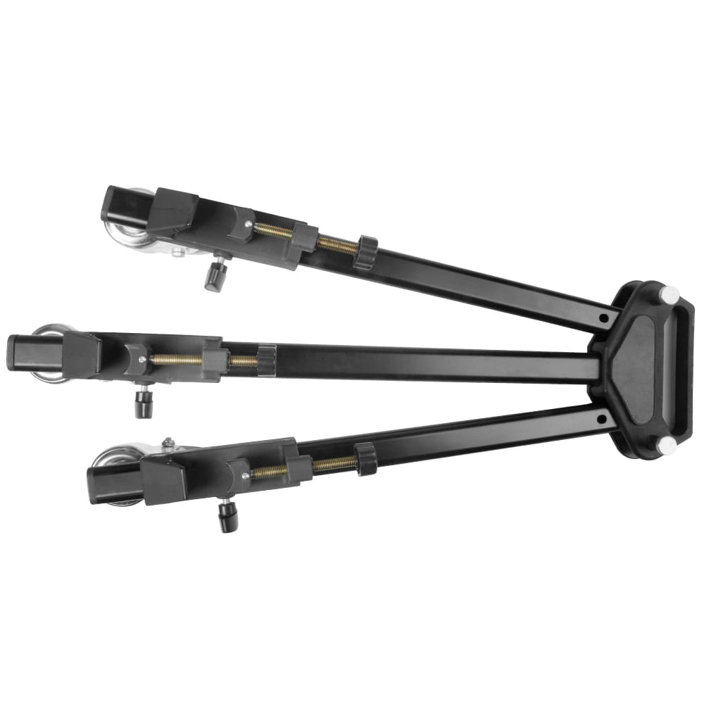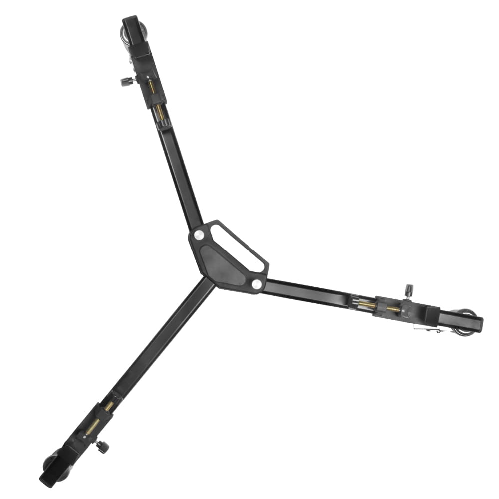 Wózek statywowy GlareOne przeznaczony do statywów o rozstawie nóg między 36 cm a 86 cm. Mocowane na docisk śrubowy nóżki statywu sprawiają ze statyw stabilnie trzyma się wózka. Jeśli potrzebna ci szybka zmiana położenia lampy lub aparatu umieszczonego na statywie nie ma lepszego rozwiązania niż wózek statywowy GlareOne. Wózek posiada 3 gumowe kółka, każde z nich wyposażone jest w mocny hamulec. Wózek jest składany do niewielkich rozmiarów, więc bez problemu może podróżować wraz z Twoim mobilnym studiem.
