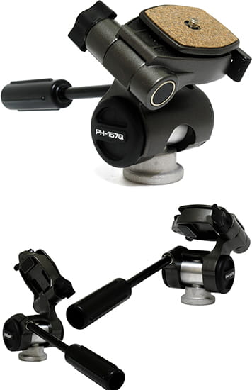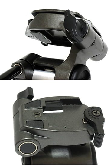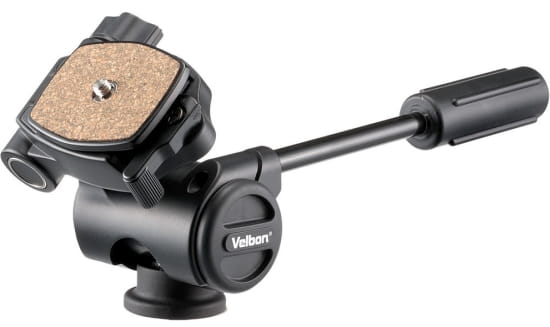 Głowica trzykierunkowa o metalowej konstrukcji, wyposażona w szybką złączkę i duży uchwyt do obracania w poziomie.