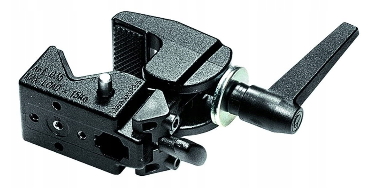 Uniwersalny uchwyt montażowy Super Clamp Manfrotto ML035. Znajdzie zastosowanie w każdym studio. Udźwig do 15 kg. Uchwyty Super Clamp pozwalają na łączenie ze sobą różnych elementów wyposażenia studia. Uchwyt zamontujesz np. na gwintowanej końcówce statywu z umieszczoną w szczękach poziomą poprzeczką lub połączysz dzięki niemu pionową kolumnę statywu z innym elementem.