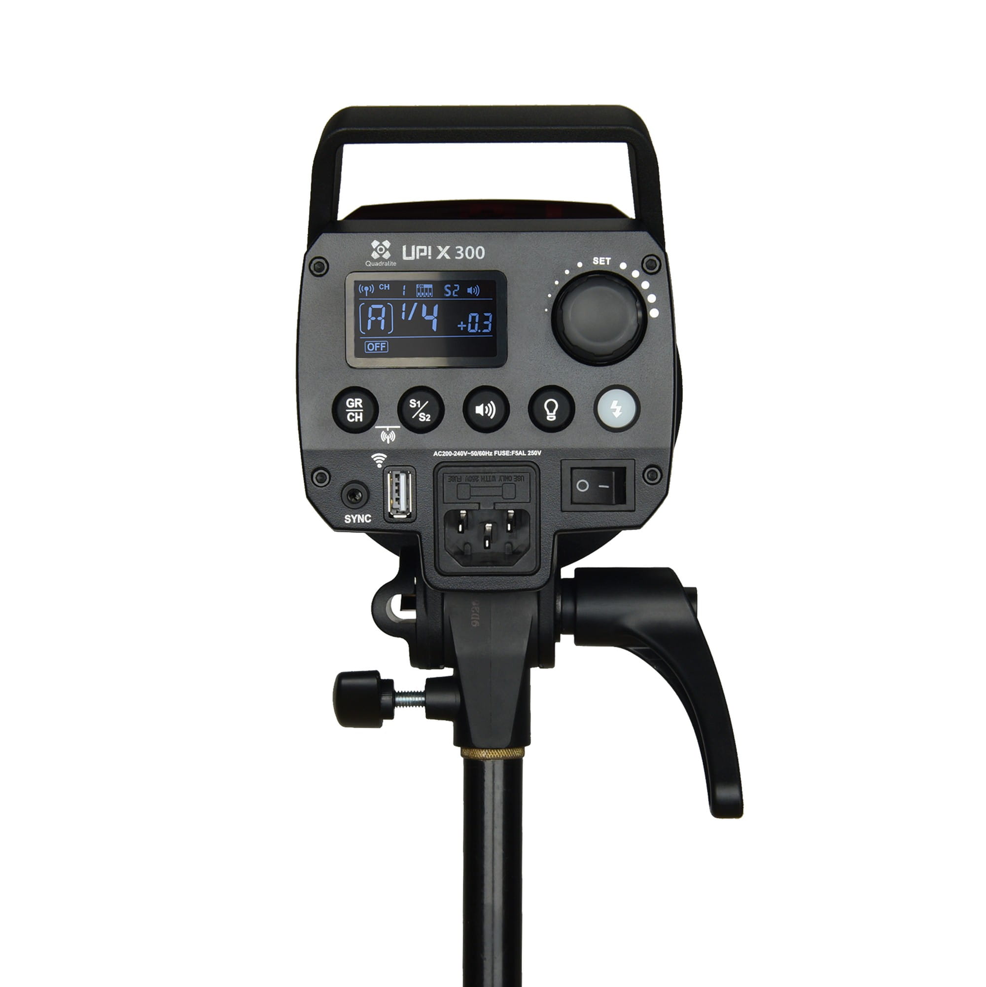 Quadralite Up! X wyróżnia się kompaktową obudową wykonaną z tworzywa sztucznego oraz niską masą (jedynie 1,3 kg). Dzięki regulowanemu skokowo uchwytowi statywowemu są w stanie pracować z softboxami do rozmiaru 120 cm, czaszami i parasolami.