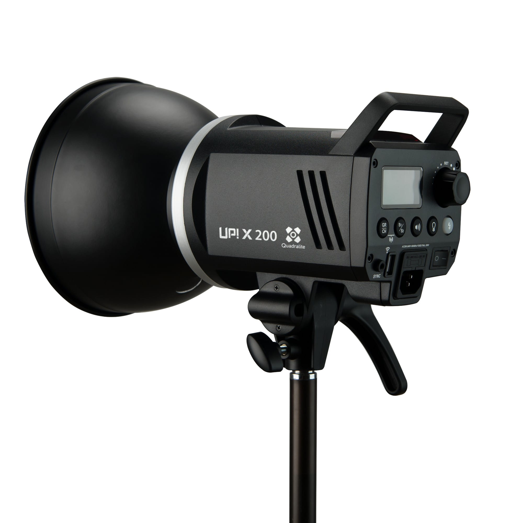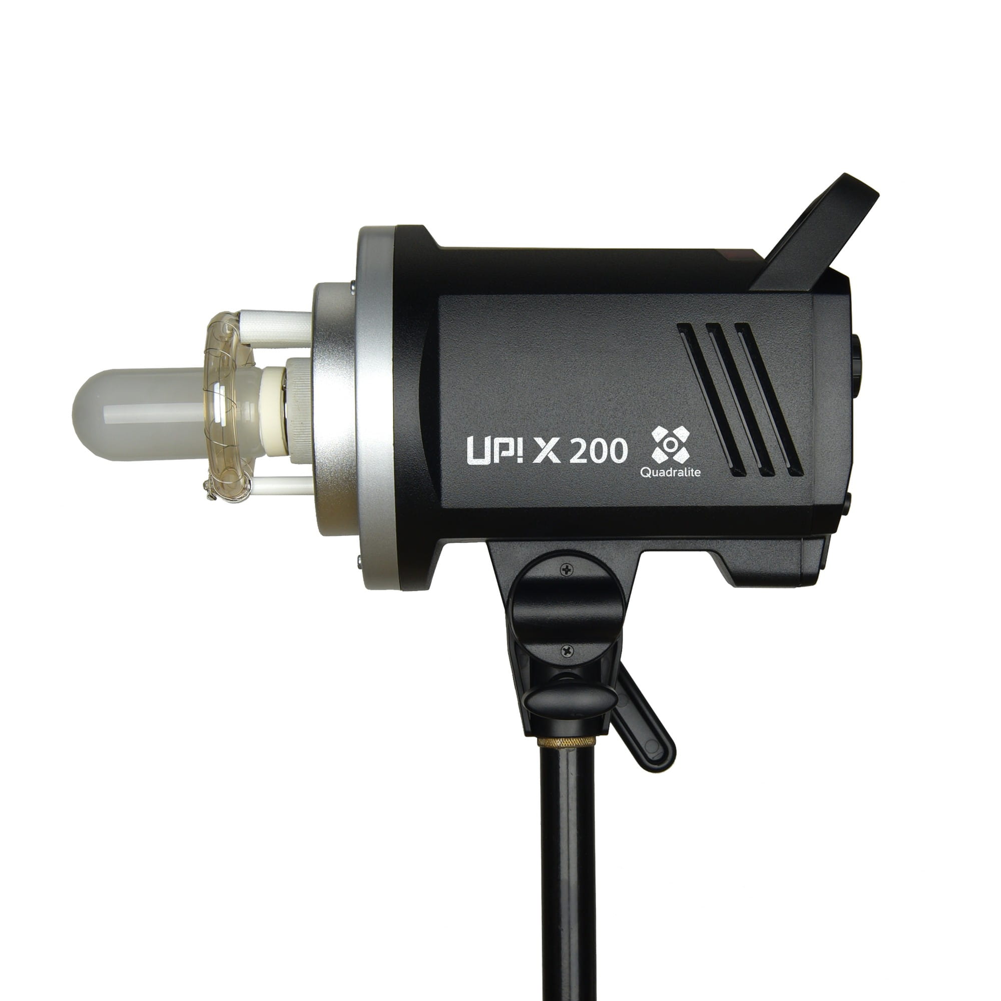 Quadralite Up! X wyróżnia się kompaktową obudową wykonaną z tworzywa sztucznego oraz niską masą (jedynie 1,3 kg). Dzięki regulowanemu skokowo uchwytowi statywowemu są w stanie pracować z softboxami do rozmiaru 120 cm, czaszami i parasolami.