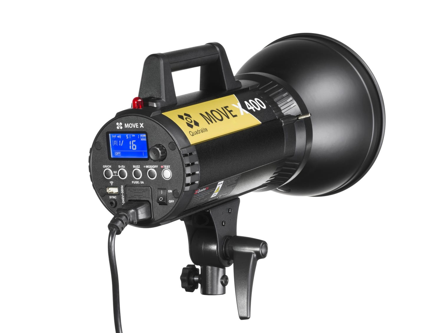 Quadralite Move X wyróżnia się kompaktową obudową wykonaną z aluminium oraz niską masą (jedynie 2kg). Dzięki metalowemu mocowaniu statywowemu pozwalającemu na regulacje kąta pochylenia lampa jest w stanie utrzymać softboxy do rozmiaru 120 cm.