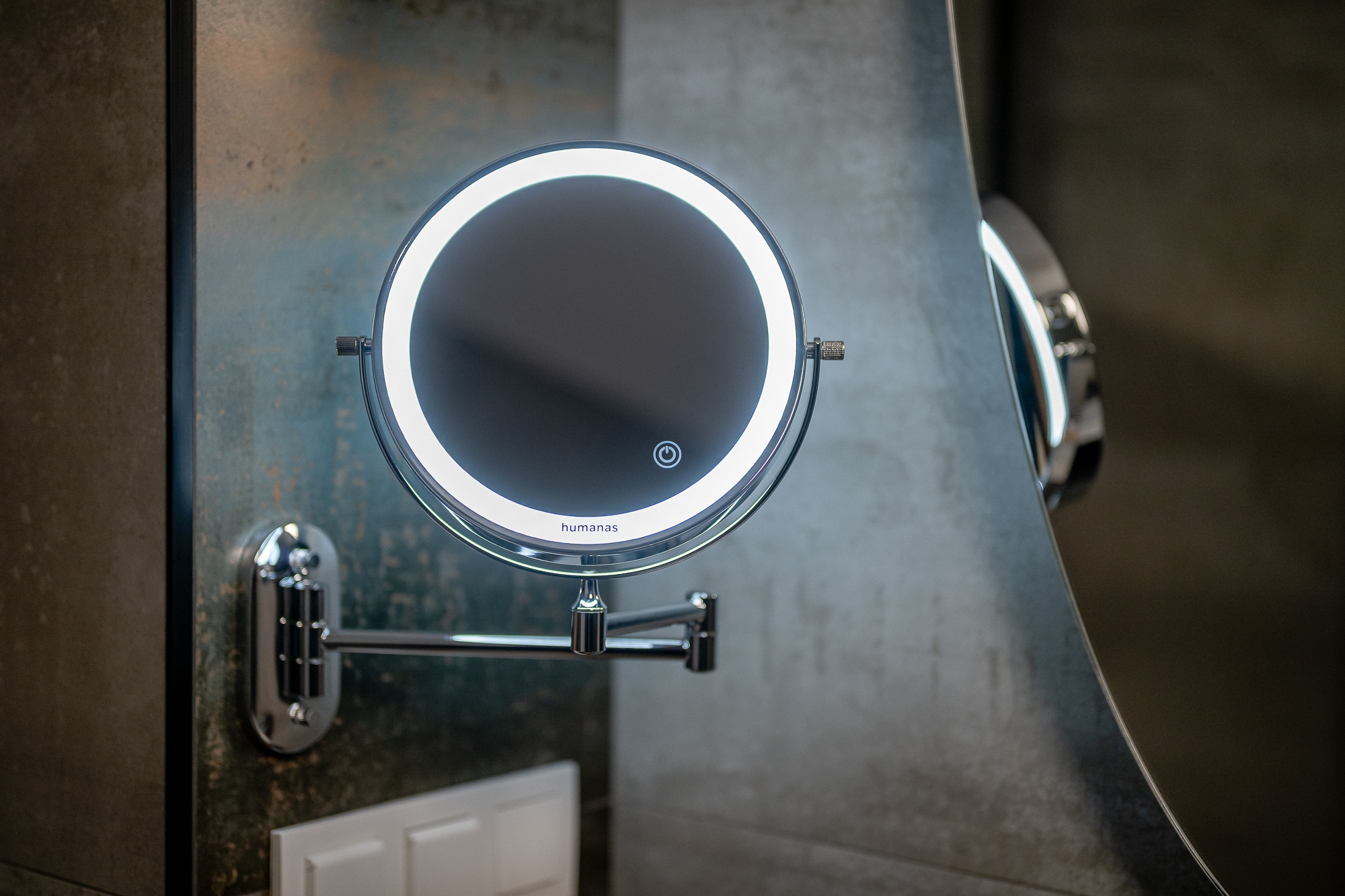 Lustro Humanas HS-BM01 to idealny wybór do każdej łazienki. Jego obie tafle o średnicy 20 cm zapewniają jasne podświetlenie LED, z regulacją mocy i 3 wariantami temperatury barwowej. Jedno z dostępnych luster oferuje również 5-krotne powiększenie. Wybierając ten model, nie musisz martwić się o dostęp do gniazdka elektrycznego. Srebrne lustro Humanas HS-BM01 wyposażono w akumulator o pojemności 2000 mAh. Wystarczy, że co jakiś czas podłączysz je do ładowarki lub power banku za pomocą dołączonego do zestawu kabla USB. Lustro może przylegać do ściany lub zostać rozłożone na odległość do 29 cm. Wszystko dzięki zastosowaniu przegubowego uchwytu, który z łatwością zainstalujesz na ścianie. Potrzebujesz zaledwie kilku minut, aby lustro Humanas HS-BM01 stało się ozdobą Twojej łazienki!