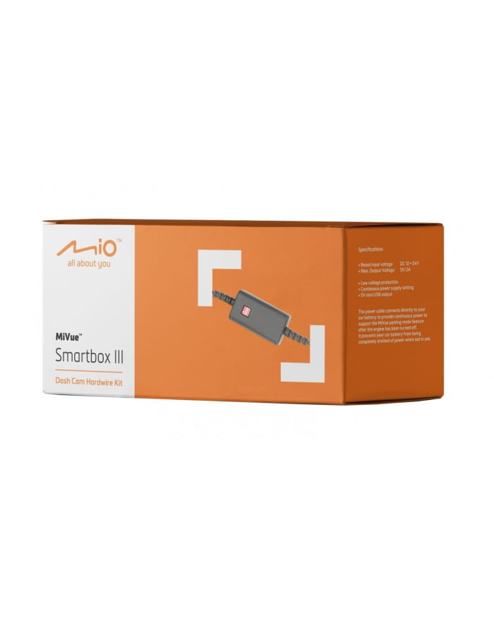 | Cechy produktu | Zasilacz trybu parkingowego - wspiera tryb parkingowy rejestratora Mio MiVue gdy silnik zostaje wyłączony. Zapobiega rozładowaniu się akumulatora w aucie. Dostosowany do instalacji zasilania w aucie osobowym (12V), jak i ciężarowym (24V). Z Mio MiVue Smar |