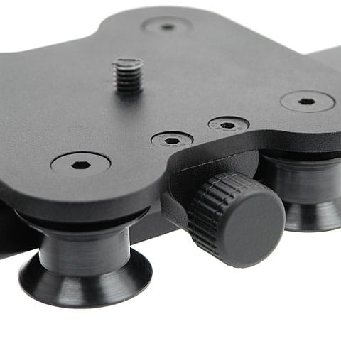W spodniej części profilu prowadzącego znajdują się płytka montażowa pozwalająca na przymocowanie slidera do statywu. Gwintowane otwory 3/8” i 1/4” zapewniają mocowanie slidera na głowicy lub bezpośrednio na kolumnie statywu. Za pomocą monety możemy poluzować śruby blokujące i przesunąć płytkę montażową w dowolne miejsce slidera.