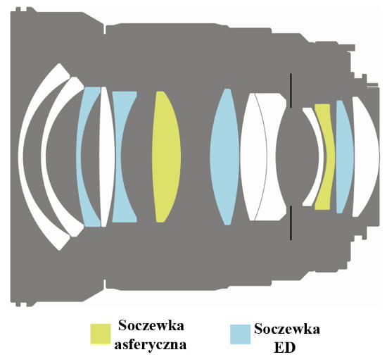 | Budowa | 13 elementów w 12 grupach, cztery soczewki ze szkład o niskim współczynniku dyspersji, dwa elementy asferyczne |
