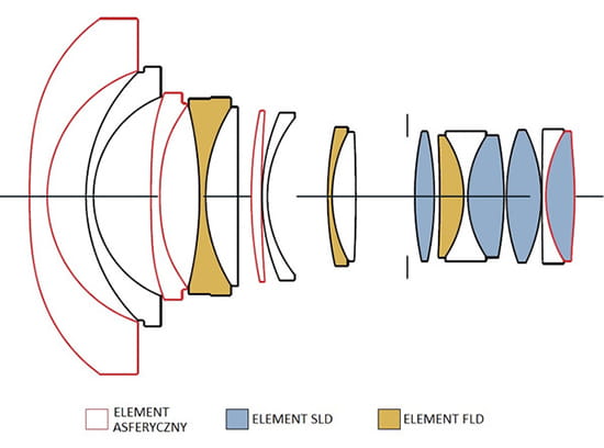 Do budowy obiektywu wykorzystano 16 soczewek, ułożonych w 11 grupach. Zastosowano w nim aż 10 soczewek specjalnych. Wśród nich znalazły się elementy ze szkieł SLD, FLD oraz bardzo skomplikowane soczewki asferyczne, zapewniające ostrość obrazu również na brzegach kadru.