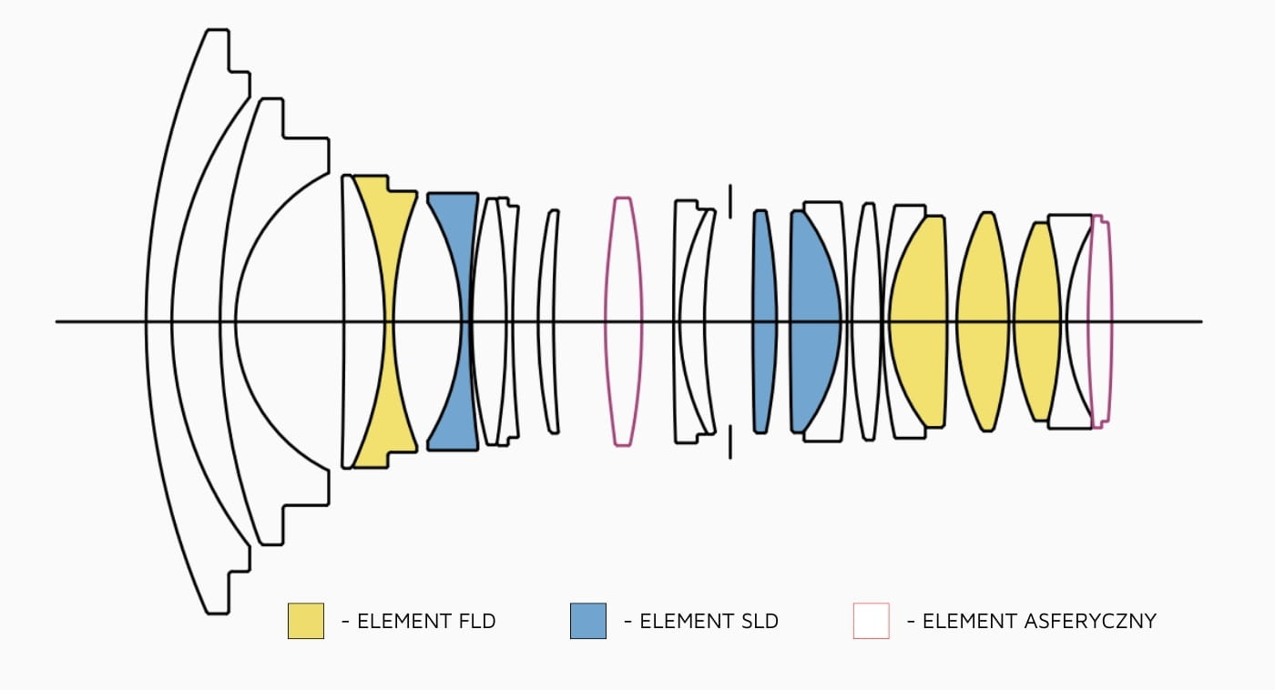 - Niezwykle zaawansowana konstrukcja optyczna (4 soczewki FLD, 3 SLD i 2 asferyczne) koryguje wszelkiego rodzaju aberracje (w tym komę)