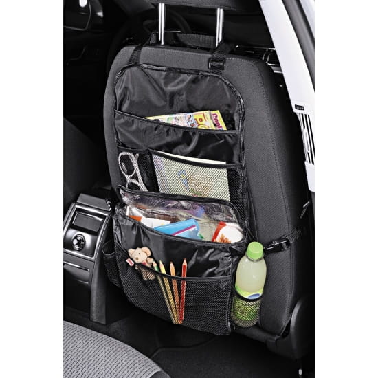 Organizer na różne akcesoria w pojeździe. Z regulowanymi taśmami, do przymocowywania do tyłu przednich siedzeń. Oddzielne kieszenie zapewniają szybki dostęp:. 1 kieszeń z izotermą, np. na zimne lub gorące napoje. 3 kieszenie na napojów. 2 kieszonki siatkowe na różne akcesoria, np. na okulary, telefon komórkowy, aparat wypadku, latarka itp. 1 duża kieszeń na atlas, mapy, czasopisma, kamizelki ostrzegawcze, DVD, gry itp.