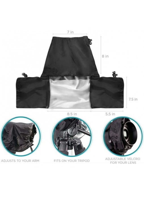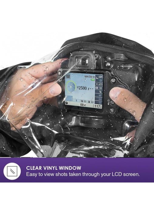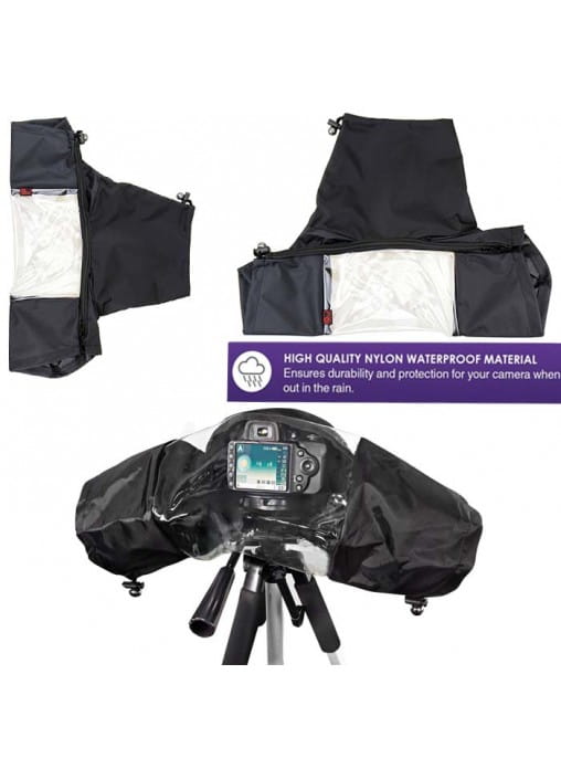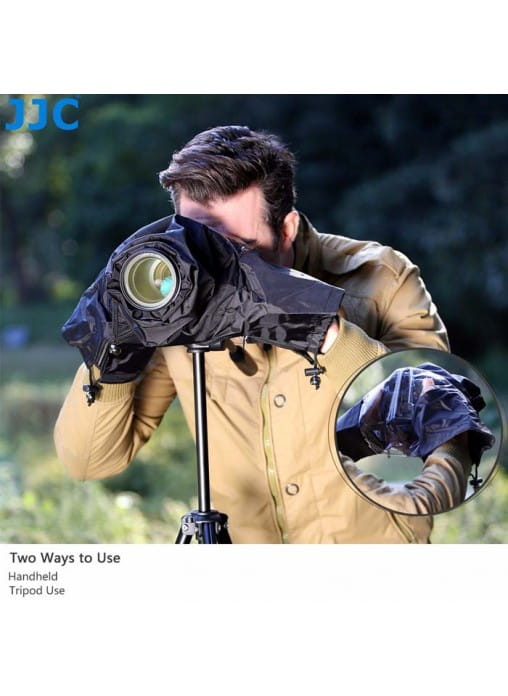 Pokrowiec przeciwdeszczowy JJC RC-1 (czarny) jest przeznaczony do małych lustrzanek, takich jak Nikon D90 i Canon EOS 7D, lub aparatów o tym samym rozmiarze lub mniejszych. Ten wytrzymały i wygodny pokrowiec przeciwdeszczowy na aparat został specjalnie zaprojektowany, aby w pełni chronić aparat cyfrowy. Pozwala na kontynuowanie fotografowania, gdy nagle złapie go deszcz. Ponieważ aparat jest zakryty, może również chronić go przed kurzem i nagłymi upadkami. RC-1 można szybko nasunąć na aparat. Dostęp do wszystkich elementów sterujących aparatu i obiektywu zapewniają dwa boczne rękawy. Posiada również przezroczyste okienko, które umożliwia łatwe monitorowanie przez cały czas. Podwójny zamek błyskawiczny na całej długości zapewnia dolne zamknięcie, gdy trzymasz aparat w ręku lub montujesz go na statywie.