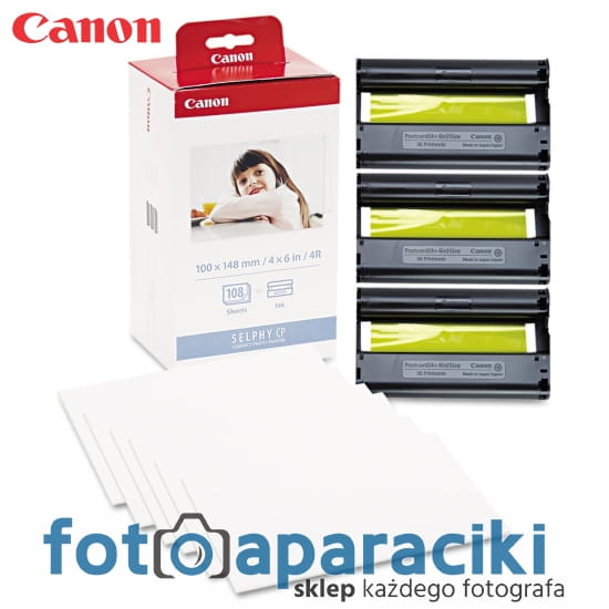 Papier termosublimacyjny do drukarek Canon SELPHY CP (CP400, 500, 700). Zestaw składa się ze 108 sztuk (3 x 36 sztuk) papieru oraz folii barwiącej. Format papieru - 10x15 cm. Gramatura papieru to 260g/m2.