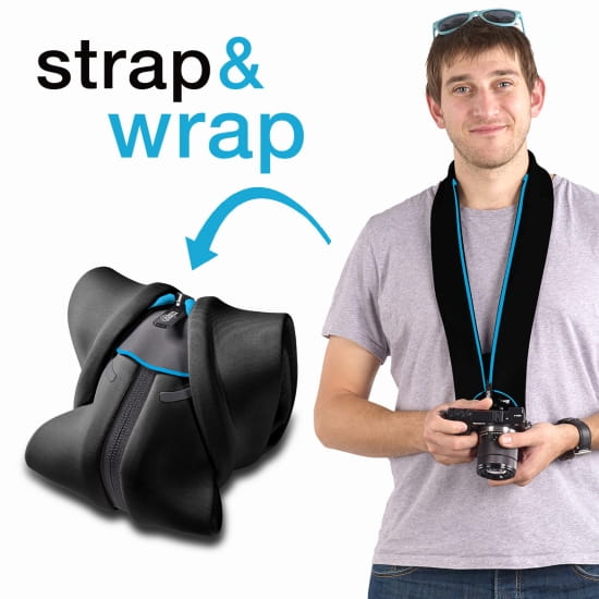 | Cechy produktu | służy jako pasek do aparatu a po owinięciu wokół niego w jednej chwili przekształca się w neoprenowy pokrowiec; kompatybilny z większością aparatów „bezlusterkowych” wraz z szerokim wachlarzem obiektywów |