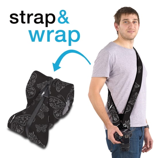 - Służy jako pasek do aparatu a po owinięciu wokół niego w jednej chwili przekształca się w neoprenowy pokrowiec.