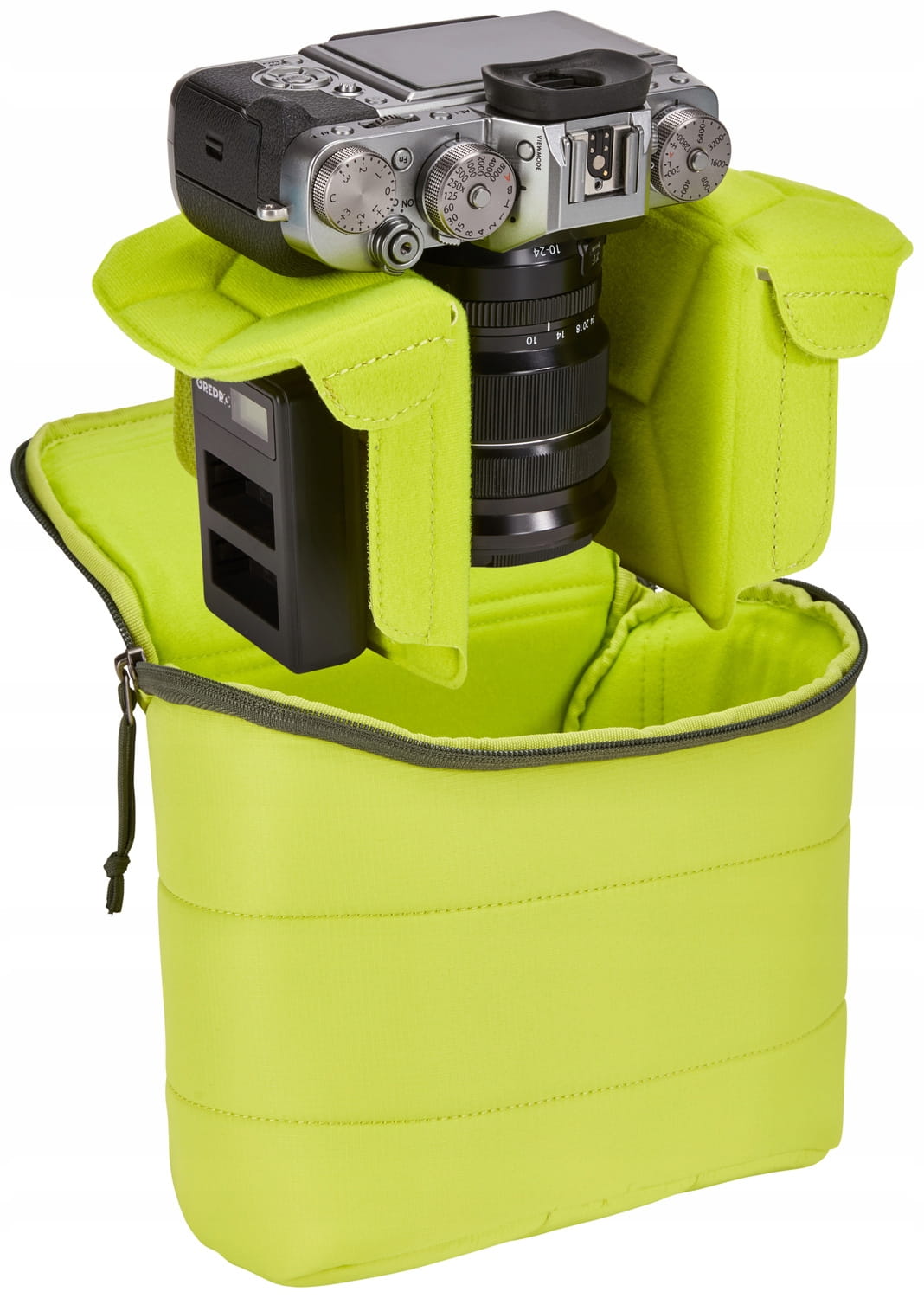 - Wnętrze dostosowane do potrzeb chroni lustrzankę lub aparat bezlusterkowy w przegrodach inspirowanych sztuką origami