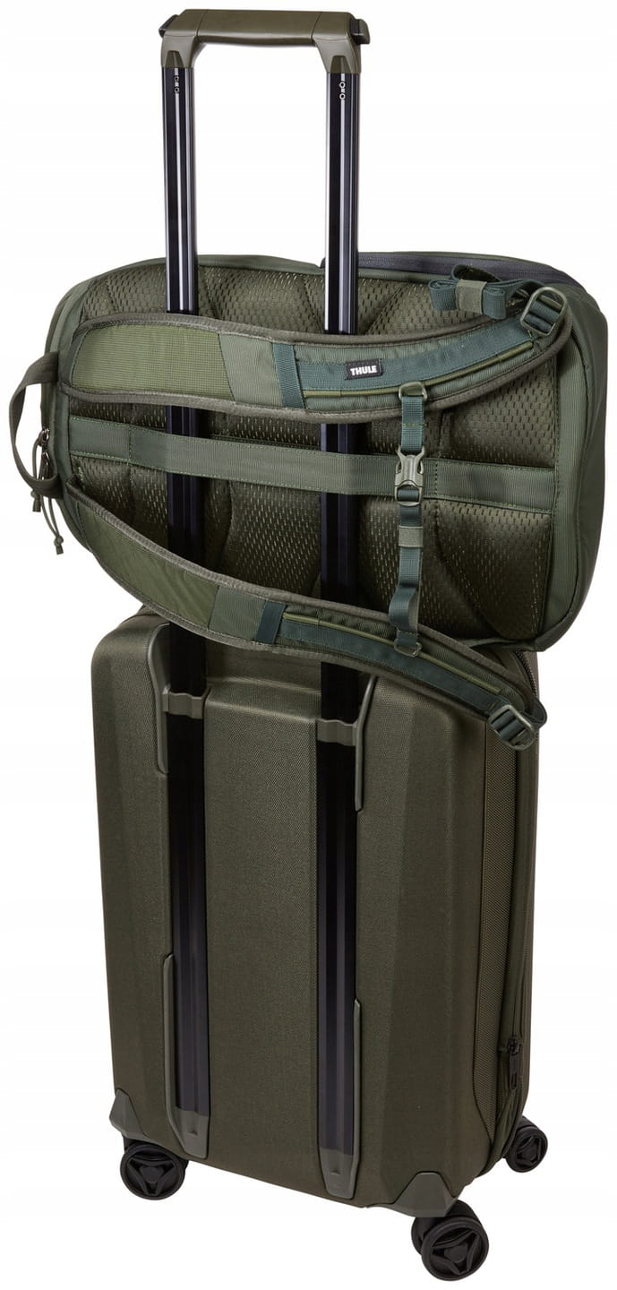 - Plecak można bezpiecznie przymocować do walizki na kółkach za pomocą specjalnych pasów