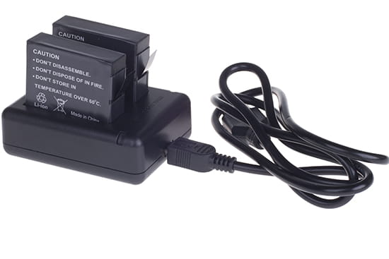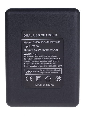 Ładowarka do akumulatorów AHDBT-401 do GoPro HERO 4. Pozwala na bezpieczne ładowanie dwóch akumulatorów poprzez gniazdo mini USB podłączone do komputera, ładowarki sieciowej lub powerbanku.