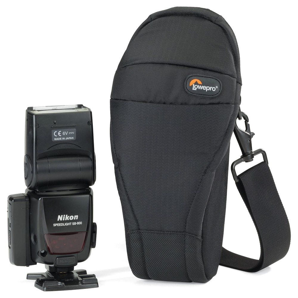 Pokrowiec na lampę błyskową Lowepro S&F Quick 75 AW z mocowaniem do pasa i paskiem przez ramię + pokrowiec przeciwdeszczowy.