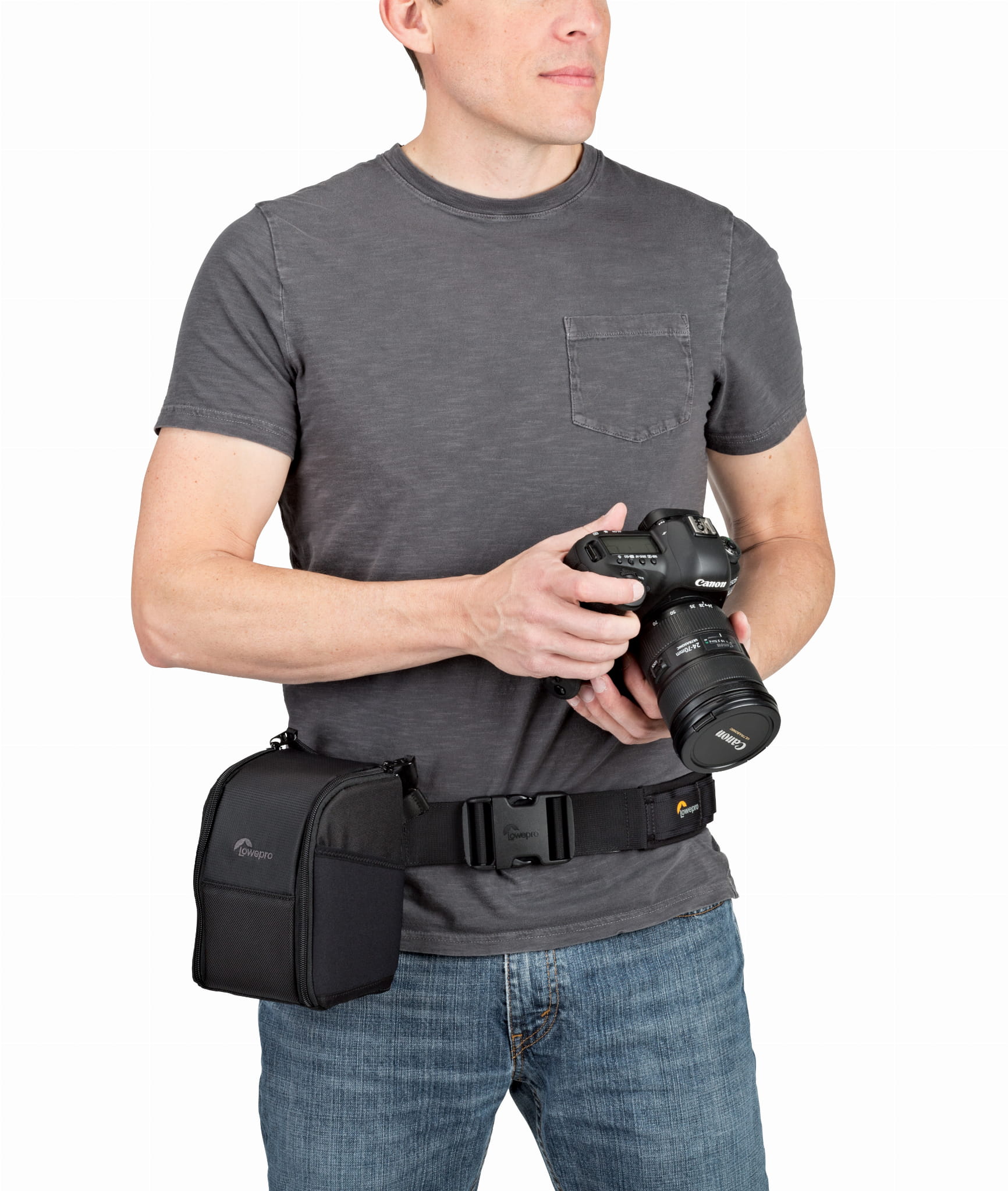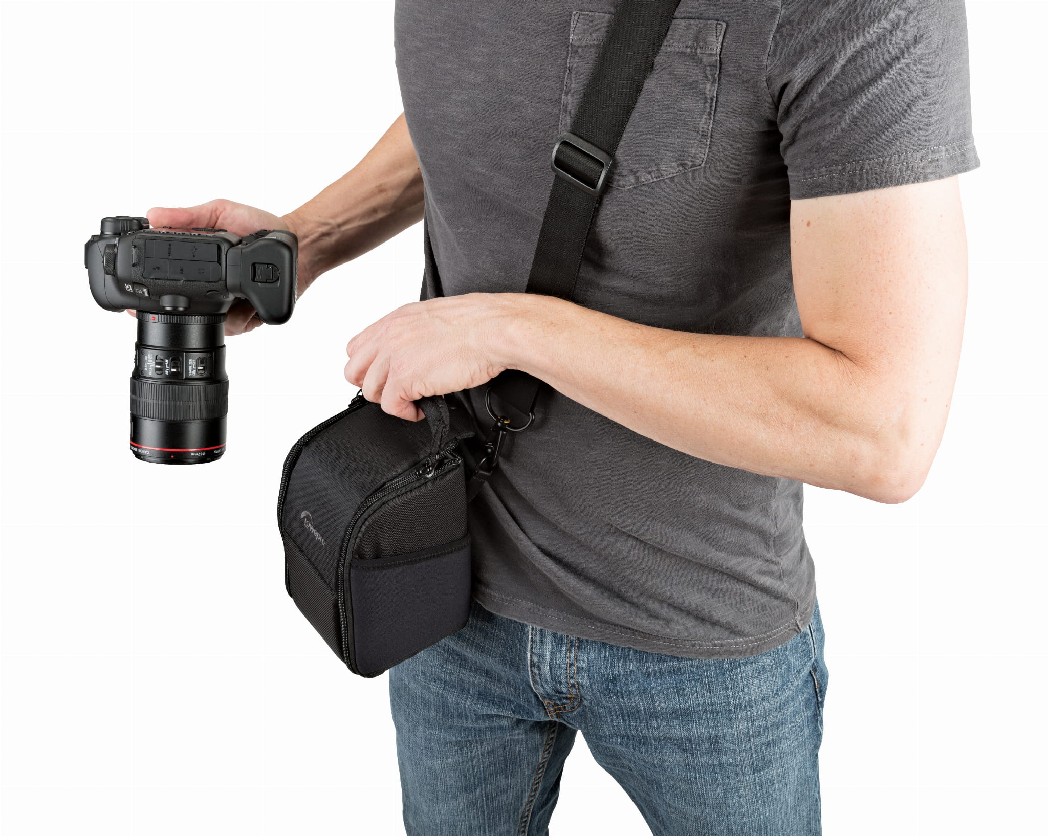 W zestawie znajduje się odpinany i regulowany pasek na ramię. Za pomocą mocowania SlipLock futerał można przymocować do pasa biodrowego Lowepro ProTactic (nr artykułu: 110317) lub plecaka ProTactic.