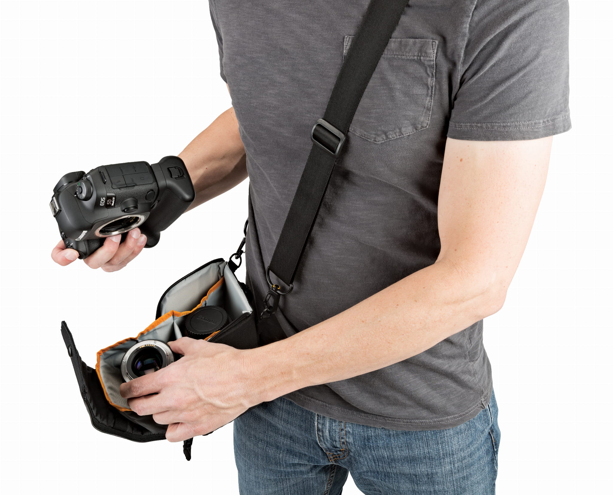 Sprytnie zaprojektowana podwójna komora rozszerz się, aby tymczasowo pomieścić dwa obiektywy umożliwiając wymianę jednego z nich za pomocą tylko jednej ręki.