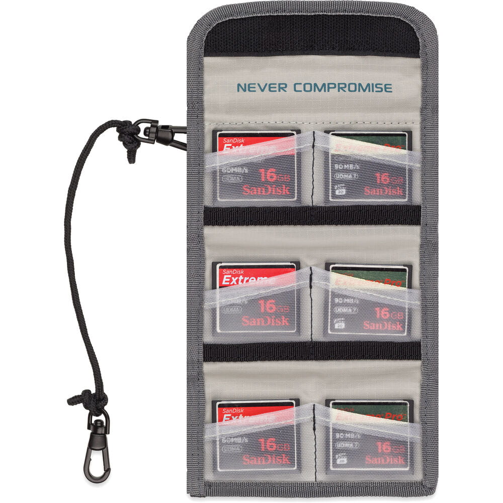 Portfel na karty TENBA Reload CF 6 pozwala na przenoszenie i przechowywanie do 6 kart CF. Portfel posiada pętlę na rzep dzięki czemu można go przymocować do pasa, paska na ramię lub do szelek plecaka. Unikalne ukośne kieszenie ułatwiają szybkie wyjmowanie kart, a dołączony kabel zabezpieczający pozwala przymocować portfel do torby lub statywu. Przezroczysta tylna kieszonka jest idealna do przechowywania wizytówek.