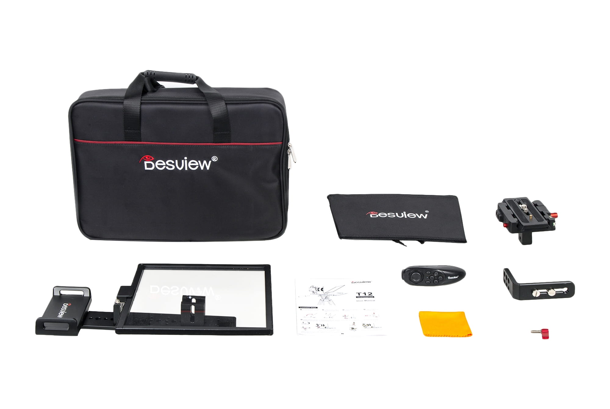 Model T12 to jeden z najbardziej wszechstronnych teleprompterów w rodzinie Desview. W zestawie z urządzeniem znajdziesz profesjonalne akcesoria montażowe, dzięki którym w ciągu kilku minut urządzenie będzie gotowe do pracy z kamerami, lustrzankami lub bezlusterkowcami. Wśród akcesoriów nie zabrakło płytki szybkiego montażu oraz płytki kątowej L-bracket umożliwiających szybki montaż kamery w pozycji horyzontalnej lub wertykalnej. Producent zadbał również o wysokiej jakości osłonę przeciwsłoneczną, która szczelnie ochroni obiektyw przed niepożądanymi promieniami.