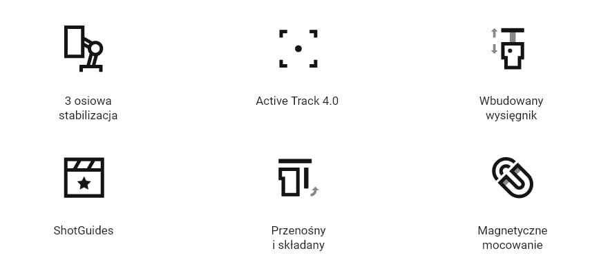 | Cechy produktu | 3-osiowa stabilizacja Activ Track 4.0 ShotGuides wbudowany wysięgnik 215 mm ministatyw w zestawie magnetyczne mocowanie ułatwiony montaż telefonu |