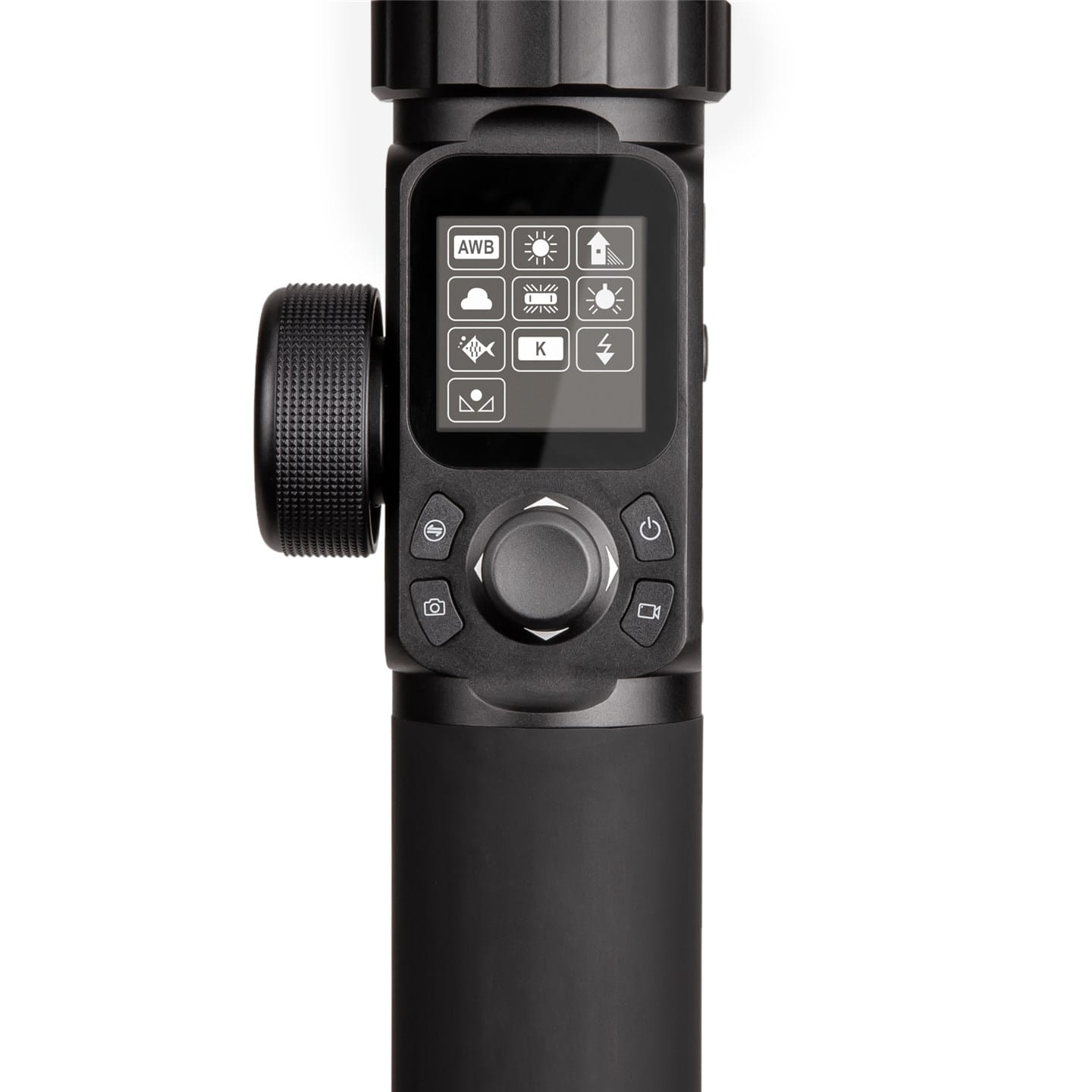 Gimbal wyposażono w dotykowy ekran LCD, który daje możliwość łatwej kontroli, zmiany trybów pracy i ustawień parametrów. Możesz wyzwalać migawkę, kontrolować ostrość, zoom, czułość, balans bieli czy regulować wartość ekspozycji.