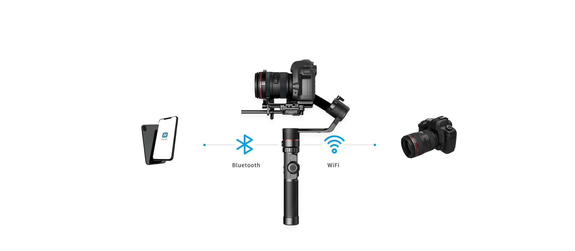 Klasyczne sterowanie ruchami gimbala za pomocą połączonej przez BT aplikacji mobilnej Feiyu ON, zostało rozszerzone o zdalną kontrolę parametrów pracy kamery czy aparatu z poziomu stabilizatora. Dzięki temu operator zyskuje znacznie większy komfort w trakcie rejestracji ujęć. Wszystko to przy wykorzystaniu przycisków oraz pokrętła funkcyjnego, umieszczonych na rączce stabilizatora.