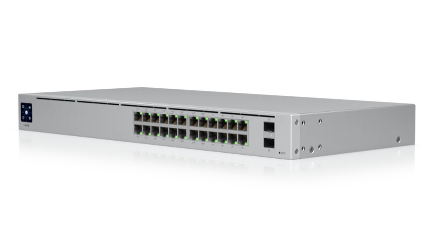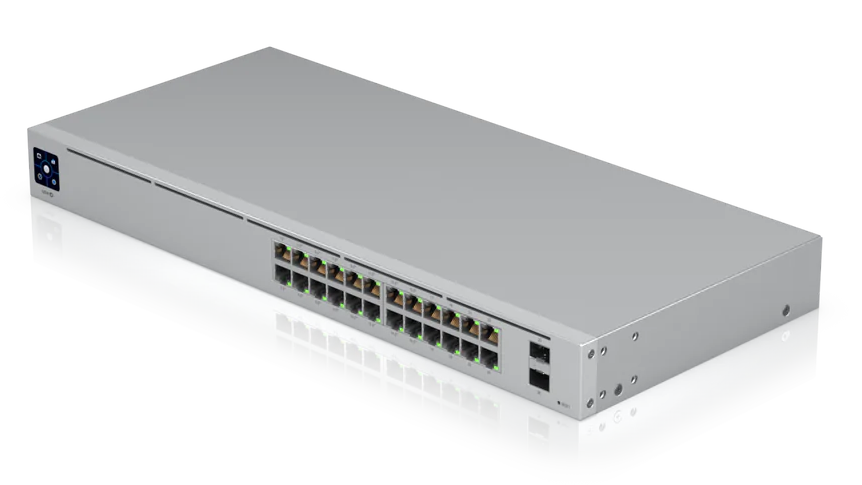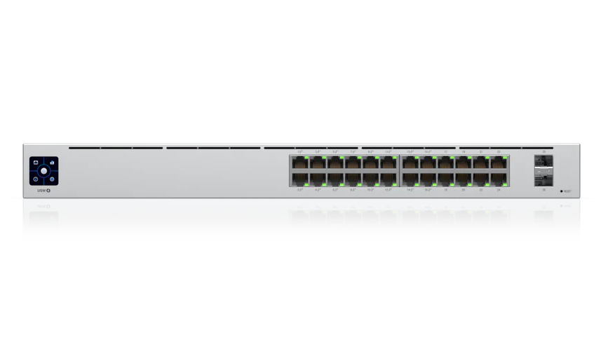 Switch 24 PoE (USW 24 PoE) to w pełni zarządzalny przełącznik z (24) portami GbE RJ45, w tym (16) portami GbE, PoE+ i (2) portami 1G SFP. Wszechstronny zasilacz USW 24 PoE zapewnia łącza Gigabit PoE do urządzeń Ethernet, a także zapewnia opcje łącza światłowodowego Gigabit nadające się do sieci korporacyjnej. Przełącznik oferuje również szeroki zestaw protokołów przełączania warstwy 2, w tym tryby pracy dla poszczególnych portów (przełączanie, dublowanie lub agregowanie) i jest wyposażony w kolorowy ekran dotykowy o przekątnej 1,3 cala LCM, który w zwięzły sposób wyświetla kluczowe informacje o systemie i połączeniach.