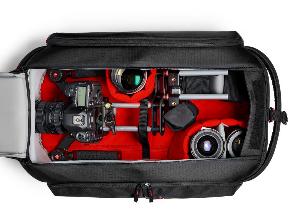 Wysokiej jakości, bardzo wytrzymały, nylonowy materiał typu RipStop chroni sprzęt przed warunkami zewnętrznymi. Wbudowana aluminiowa rama nadaje torbie dodatkowej sztywności, wytrzymałości i odporności na uderzenia. Górne dwa zamki pozwalają na łatwy dostęp do głównej komory. Jej wnętrze, dzięki regulowanym przegrodom, może być zaadaptowane na potrzeby sprzętu. System przegród Camera Protection System zapewnia dodatkowe usztywnienie i ochronę sprzętu wewnątrz. Dostarczona poduszka pod obiektyw absorbuje uderzenia i podtrzymuje obiektyw połączony z kamerą w czasie transportu.