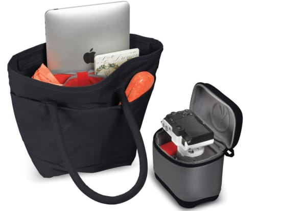 - Wnętrze wkładu zmieści średniej wielkości aparat kompaktowy lub niewielką lustrzankę z podpiętym obiektywem zoom i dodatkowy obiektyw.