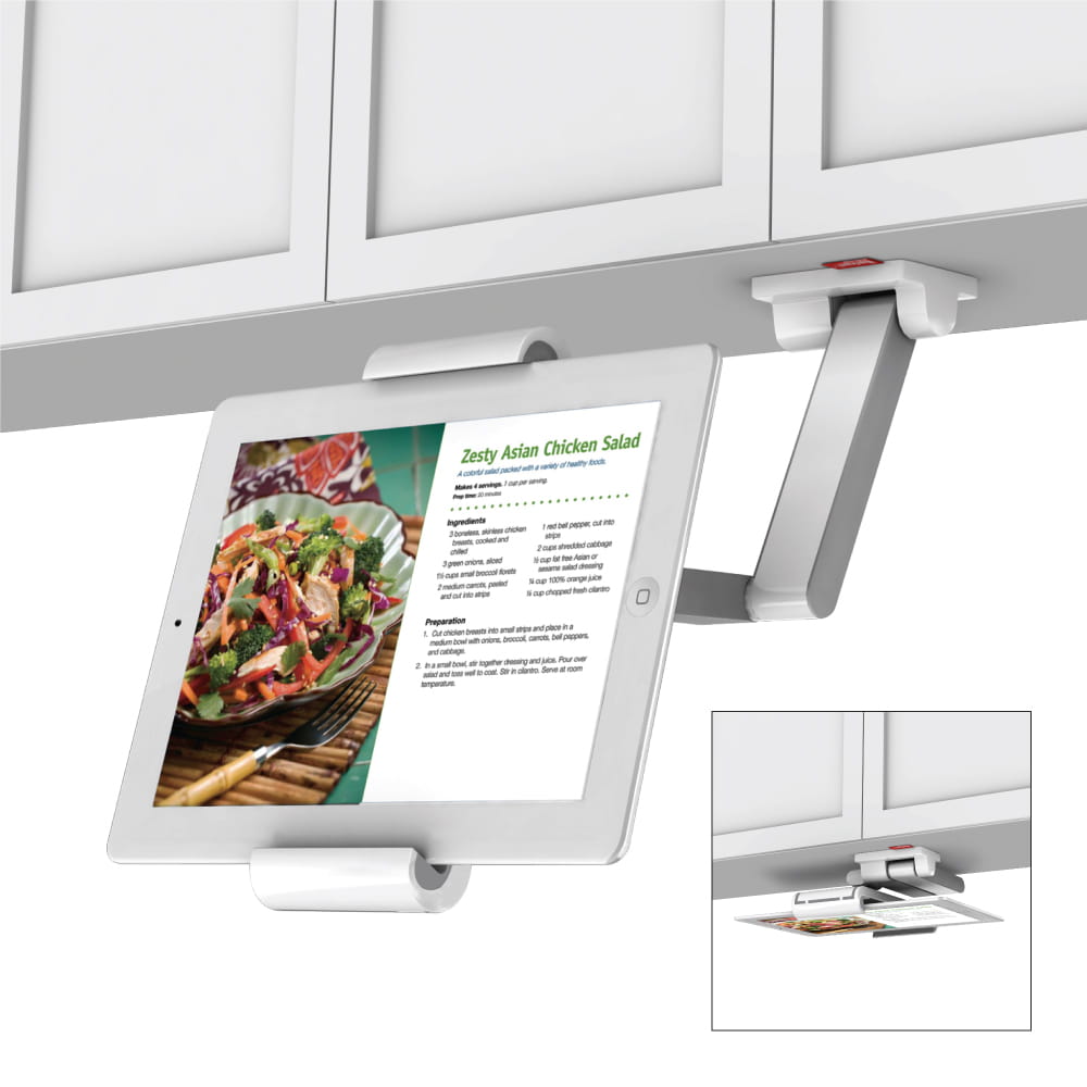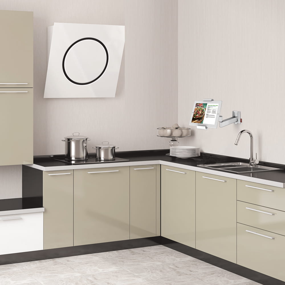 Uchwyt do tabletu, który zamontujesz do szafki kuchennej co ułatwi domownikom korzystanie z tabletu podczas codziennych prac w kuchni przy gotowaniu potraw.