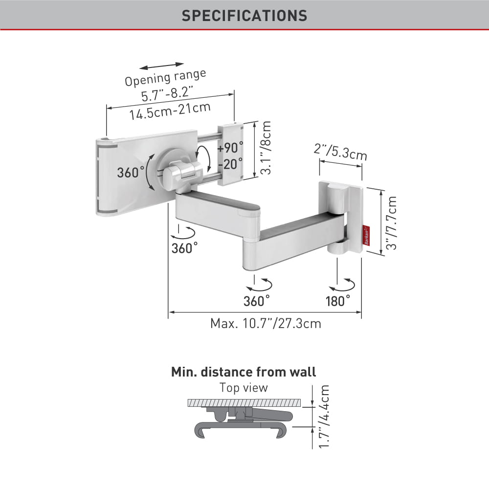 - Minimalna odległość od ściany: 1,7" / 4,4 cm.