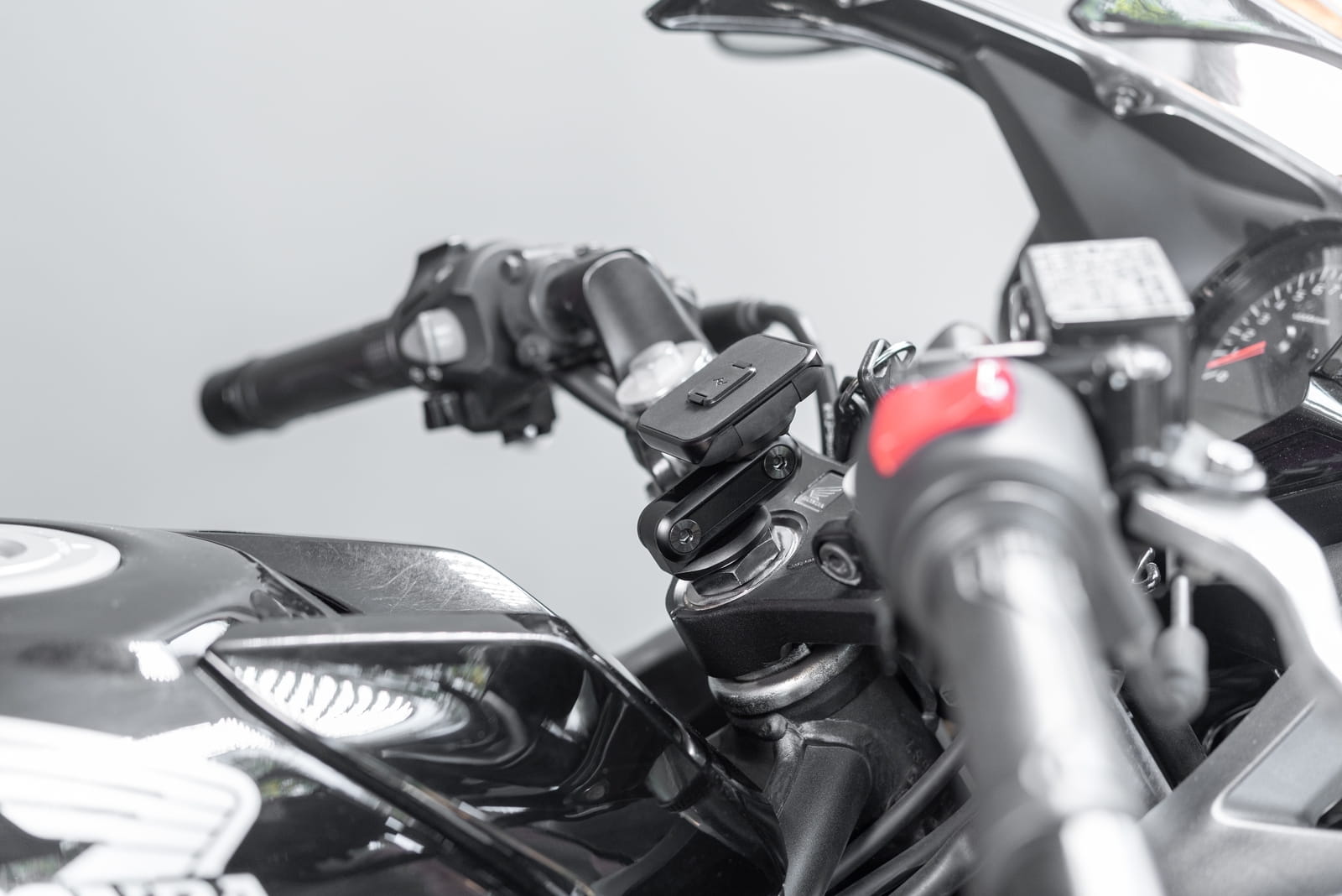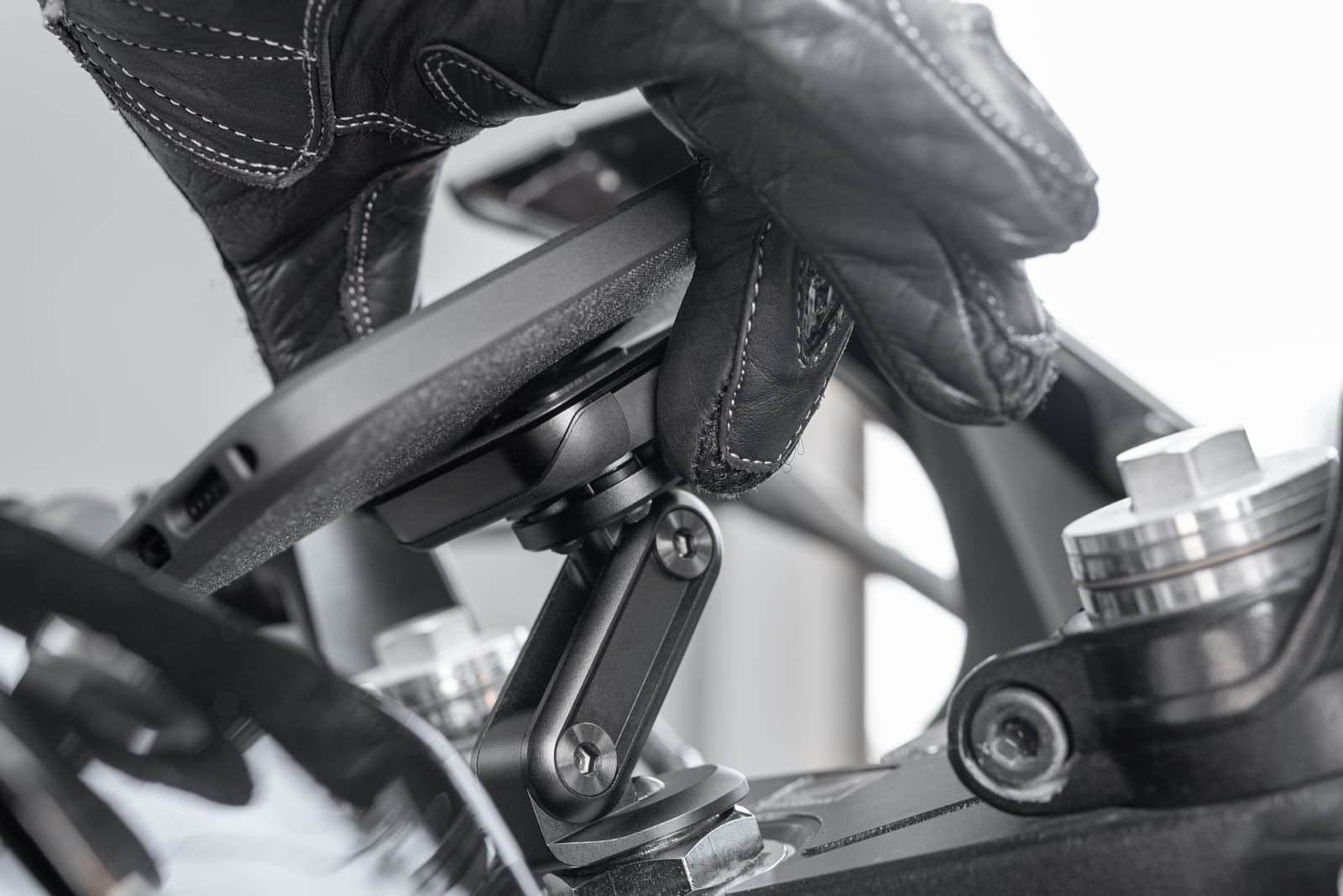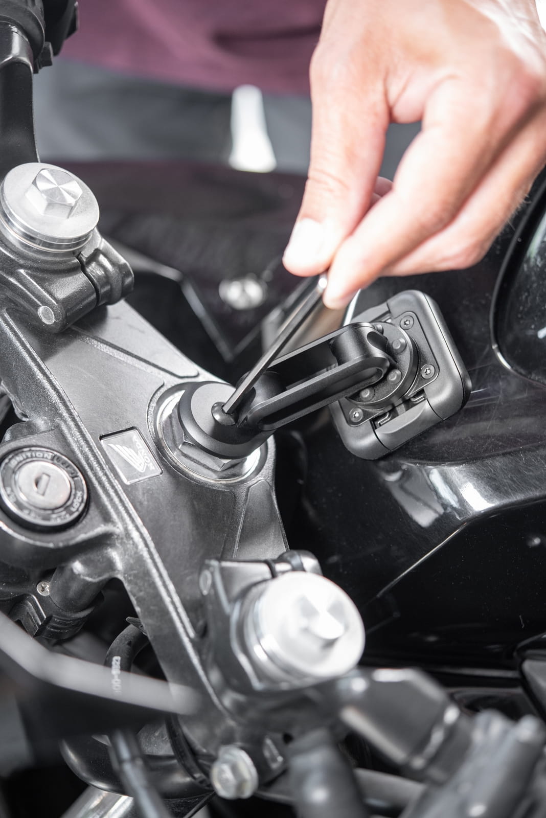 Idealny do motocykli sportowych i ulicznych z kierownicami typu clip-on, niskoprofilowy uchwyt na główkę ramy utrzymuje telefon mocno zamontowany, łatwo widoczny i łatwo dostępny. Bezpiecznie instaluje się w większości gwintów główki kierownicy za pomocą wtyczki rozszerzającej.