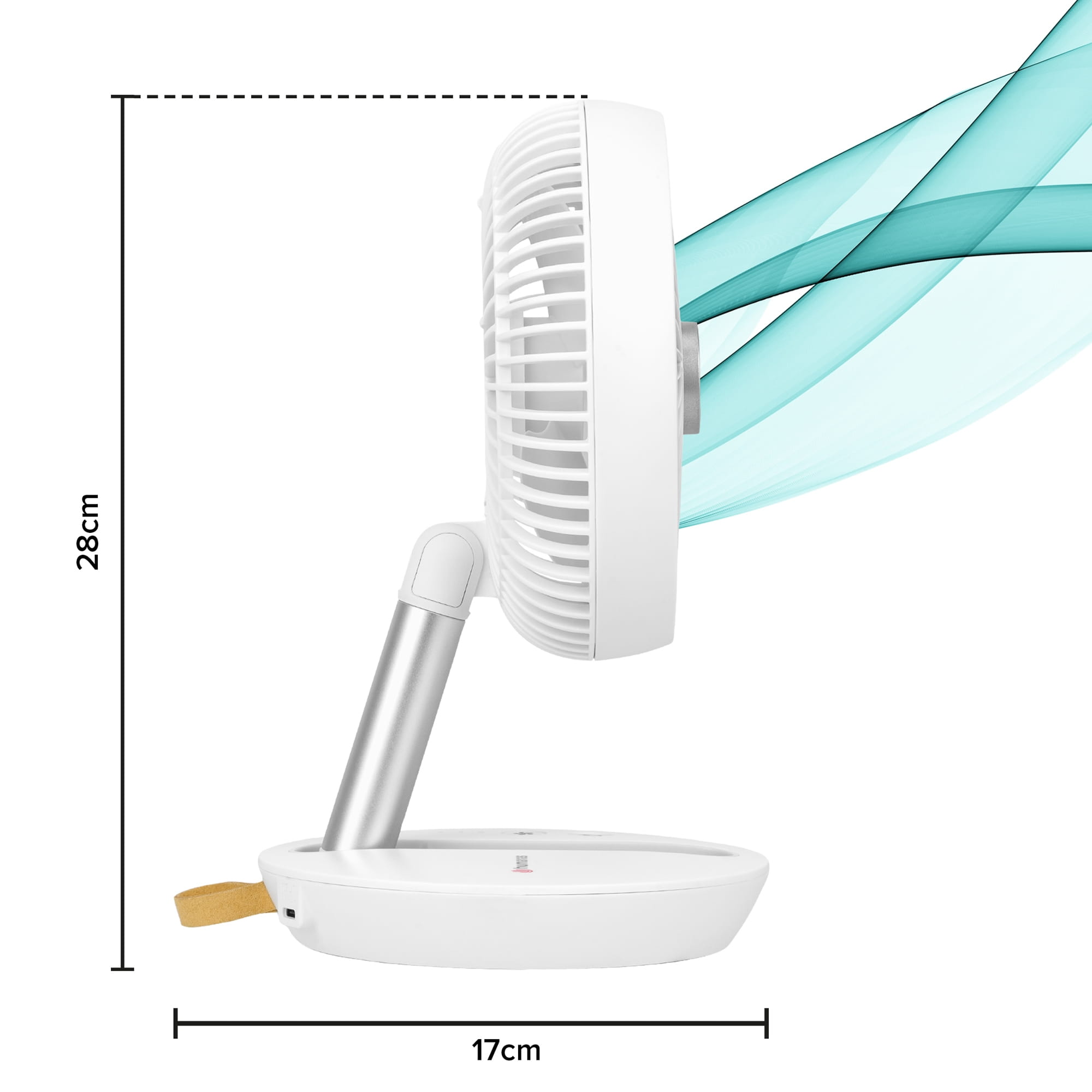 Podczas korzystania z wentylatora Humanas CoolAir F01 nie musisz martwić się o dostęp do gniazdka elektrycznego, długość kabla i to, jak blisko kontaktu znajduje się urządzenie. To jednak nie koniec udogodnień. Ergonomiczne ramię pozwoli ustawić wentylator w najbardziej dogodnej pozycji. Urządzenie może zostać odchylony do tyłu w zakresie 180º, zapewniając Ci odpowiednią kontrolę nad tym, w którą stronę skierujesz strumień chłodnego powietrza.