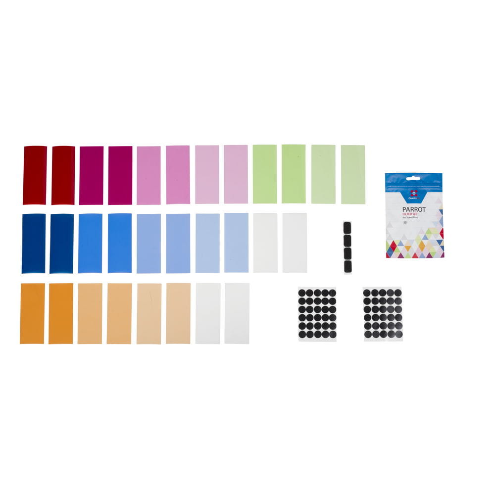 W zestawie Quadralite Parrot znajduje się 15 rodzajów filtrów (po dwie sztuki z rodzaju), od ocieplających (CTO) poprzez chłodne (CTB), zielone, magentowe, czerwone, niebieskie aż do zmiękczających (białe). W opakowaniu jest też komplet rzepów, które pozwalają na szybkie i sprawne doczepianie filtrów do głowic lamp błyskowych. Rozmiar błon jest dobrany w taki sposób, aby pasował do zdecydowanej większości dostępnych na rynku lamp reporterskich takich jak Quadralite Stroboss 60, Canon 600EX II-RT, Nikon SB-910, Sony HVL-F60M i wielu innych.