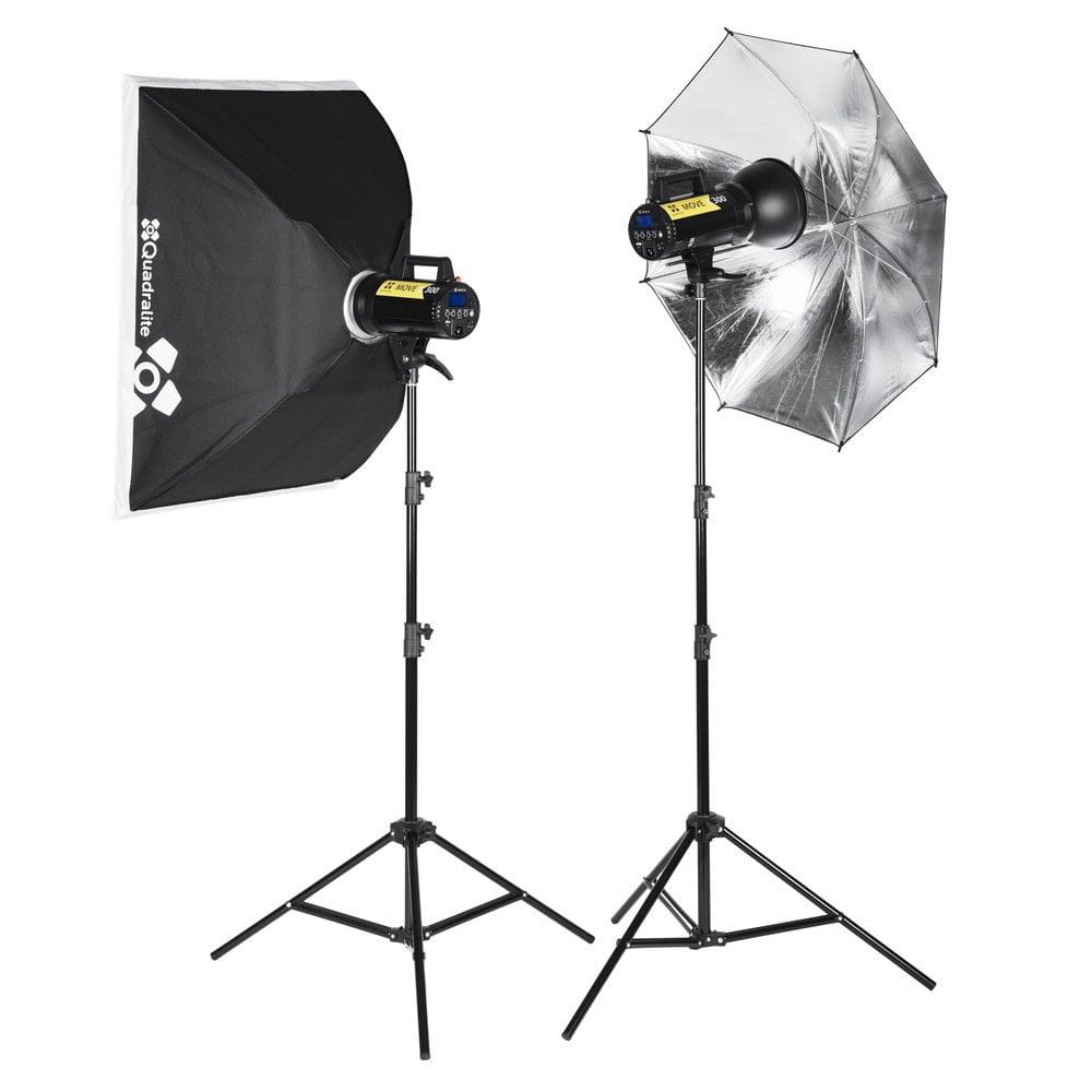 | Zestaw zawiera | dwie lampy Quadralite Move X 300, dwa statywy 200cm, jedna czasza 7' srebrna parasolka, softbox 60x90cm oryginalne opakowanie |